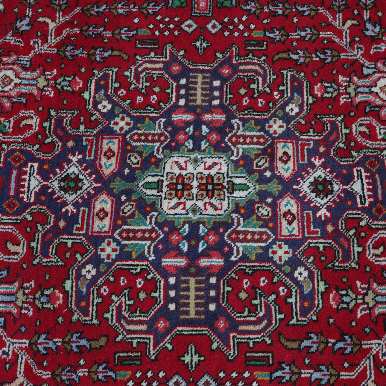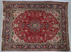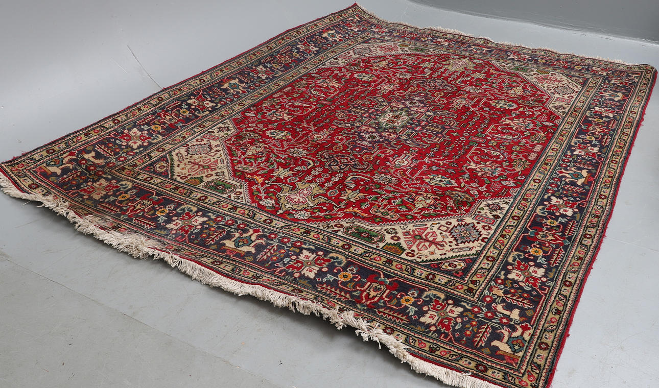 Med en stor midtertrappet medaljon med blomster og blade på rød bund, den brede kant på indigobund mellem smalle beskyttelsesstriber, 280cm x 206cm.