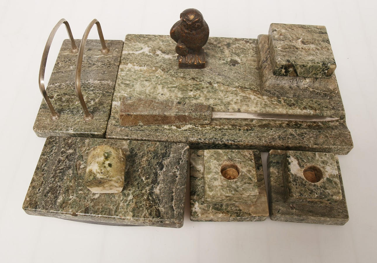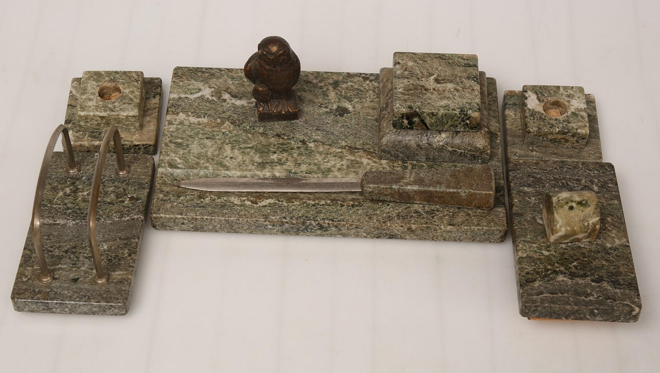 1 skrivestand 1 brevpresse 1 brevholder 1 brevkniv 2 lysestager.