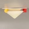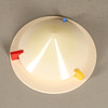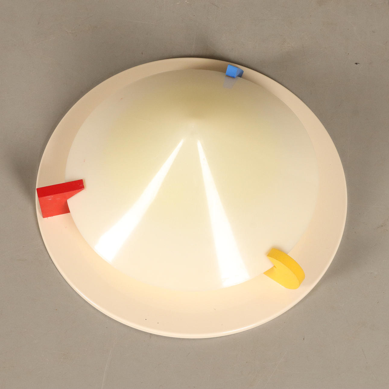 Metalramme med malede geometriske træklodser, aftagelig plastkuppel. To lyspunkter. Diameter ca 45 cm, højde ca 19 cm.