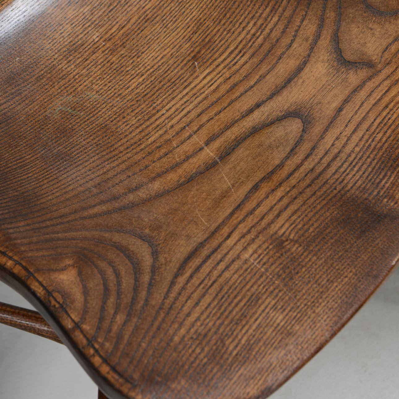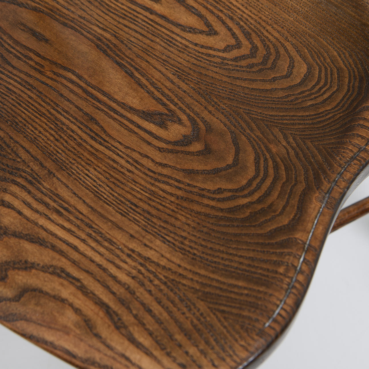 Stole i træ, bejdset. Noget skåret dekoration, forbundet benstativ. Højde 97 cm. Sædehøjde 48 cm.