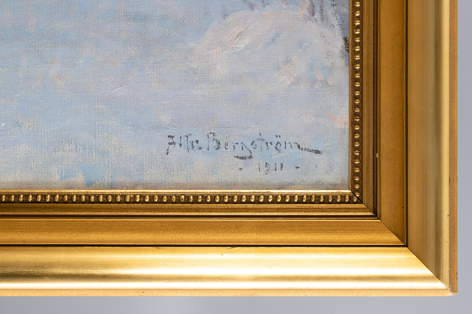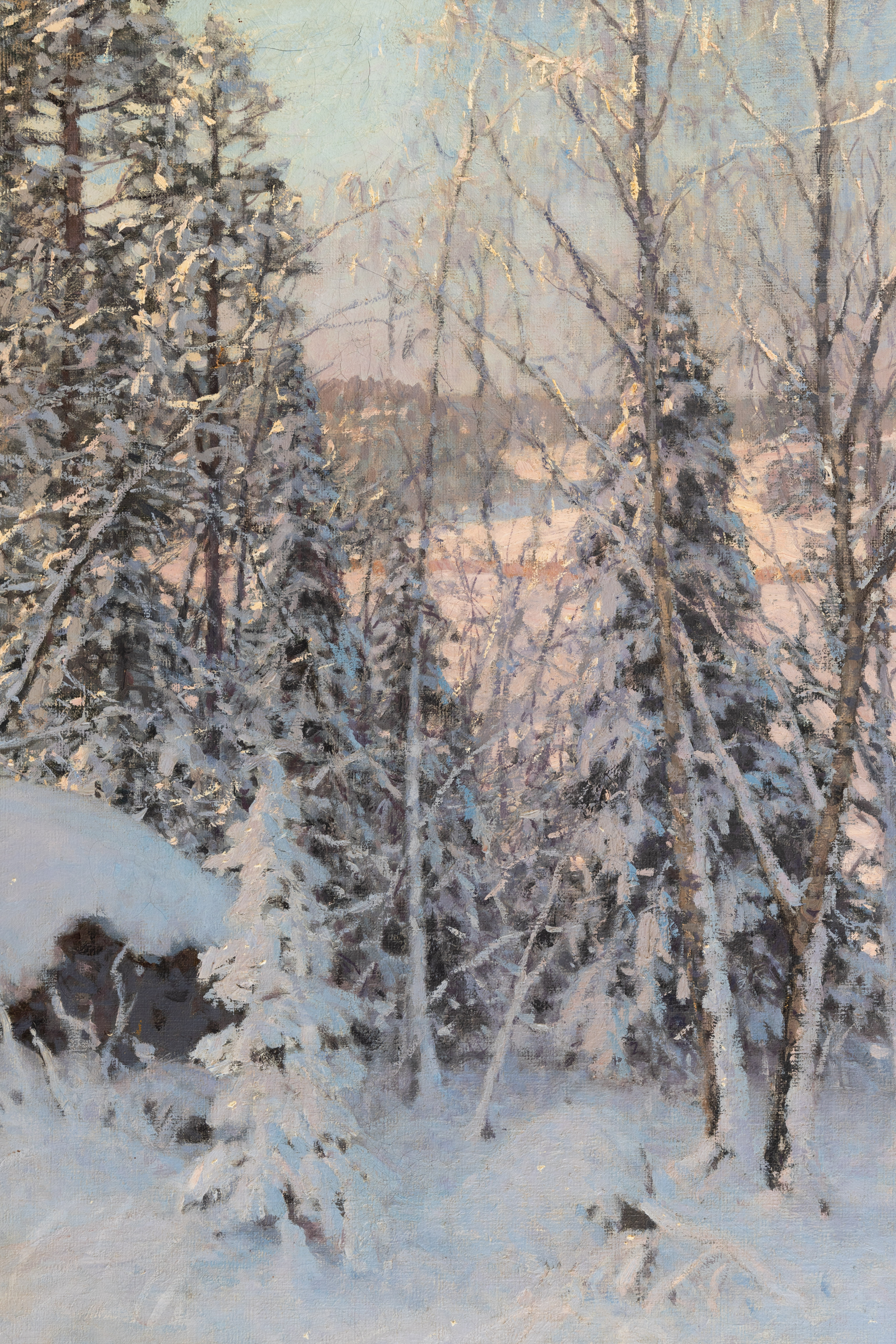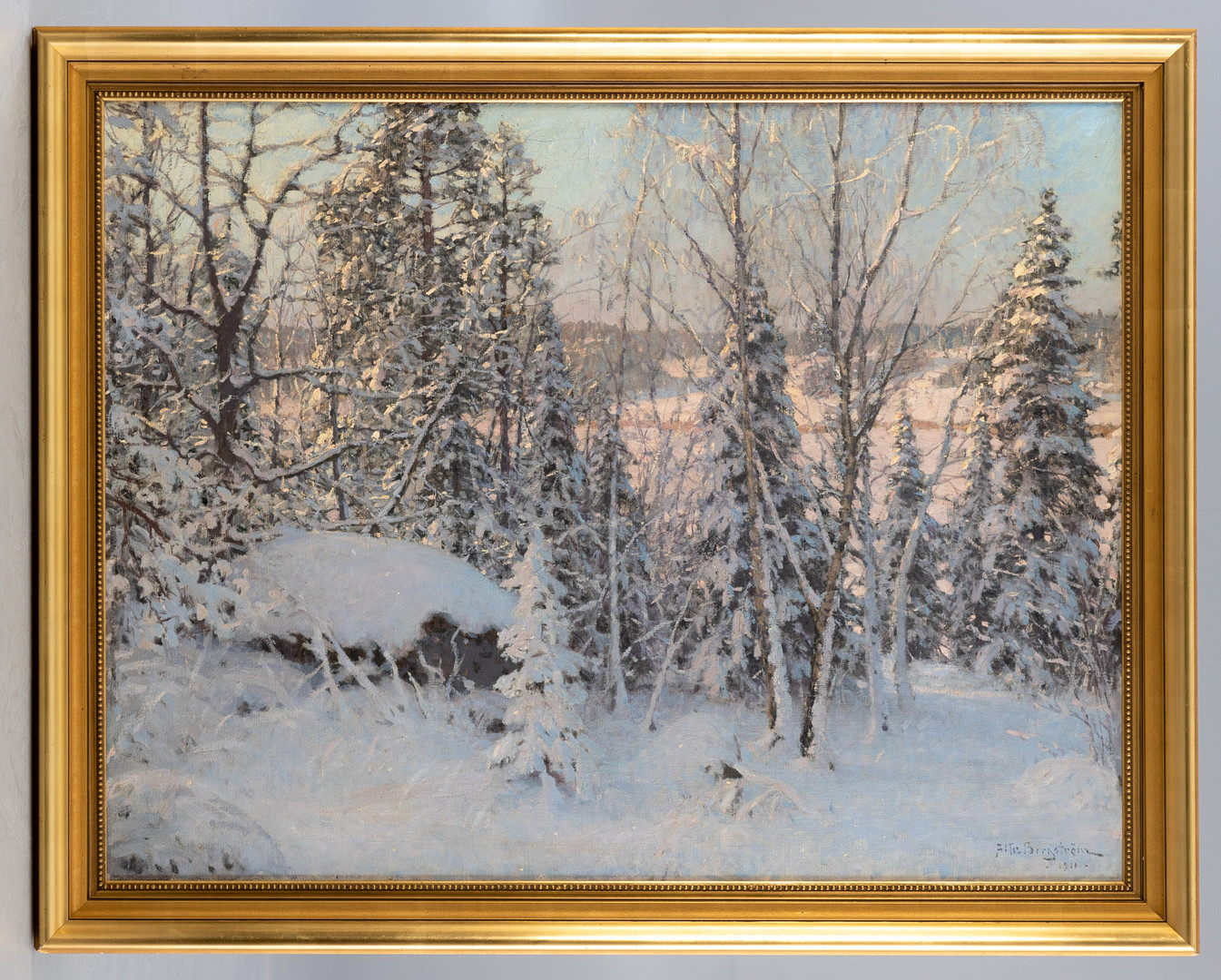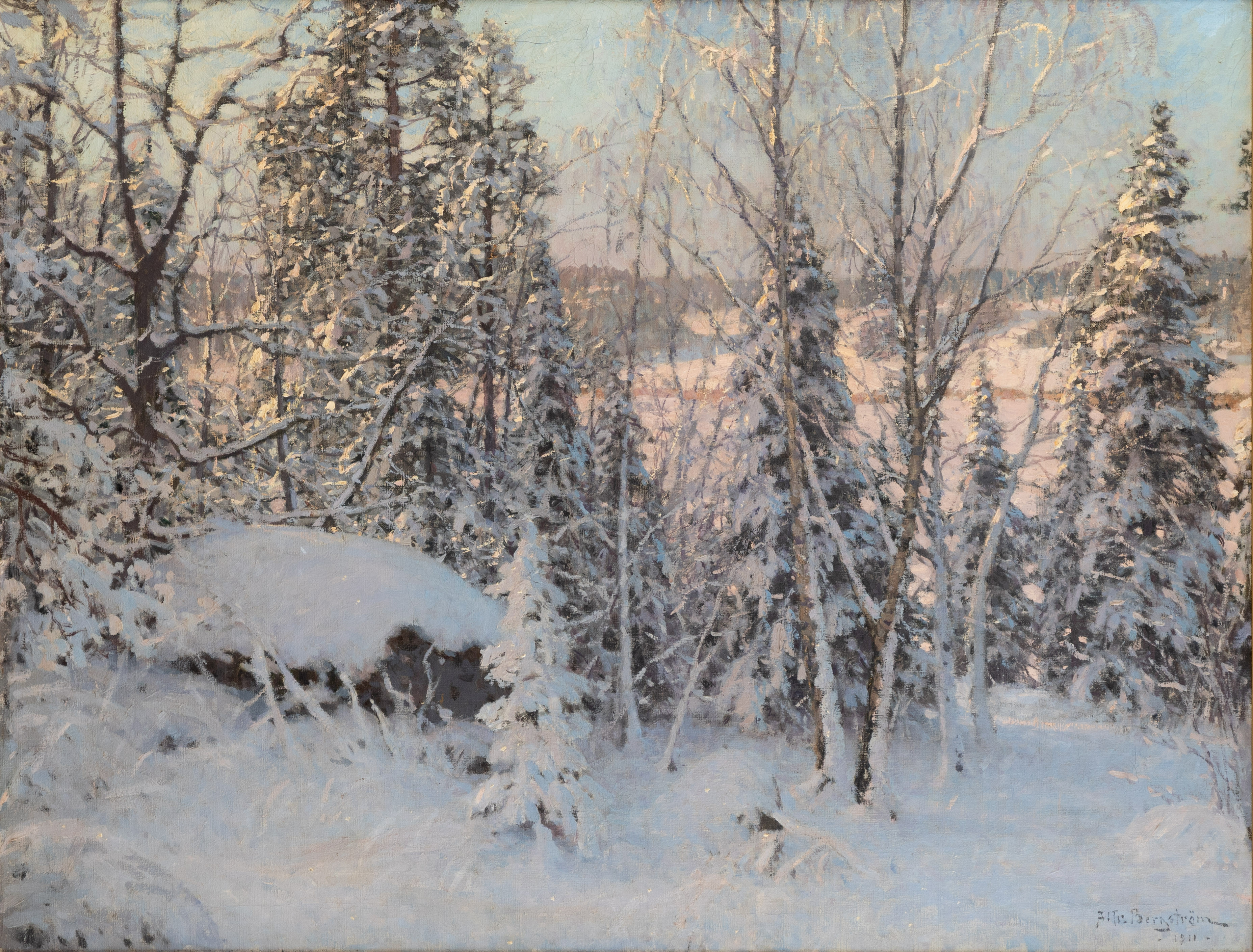 2800102. ALFRED BERGSTRÖM (1869-1930). Vinterlandskab i aftenlyset.