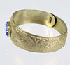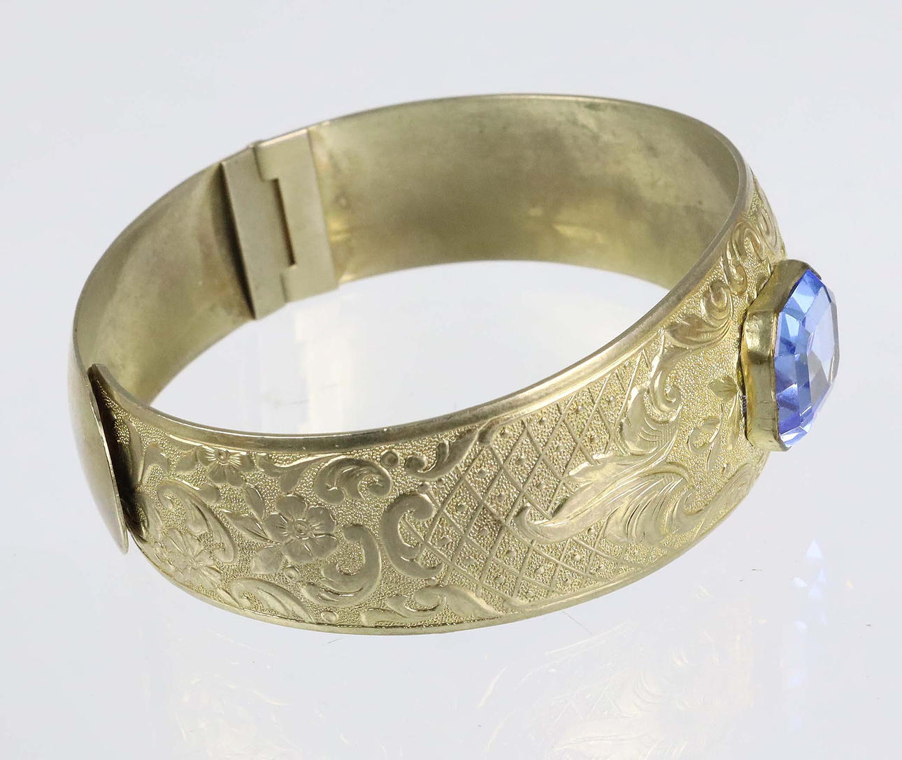 Antik armring blomstret overflade i relief, centreret med en facetteret blå spinel, indvendig diameter 6 x 5,3 cm. Bredde foran 2,2 cm, antikt smykke fra omkring 1920.