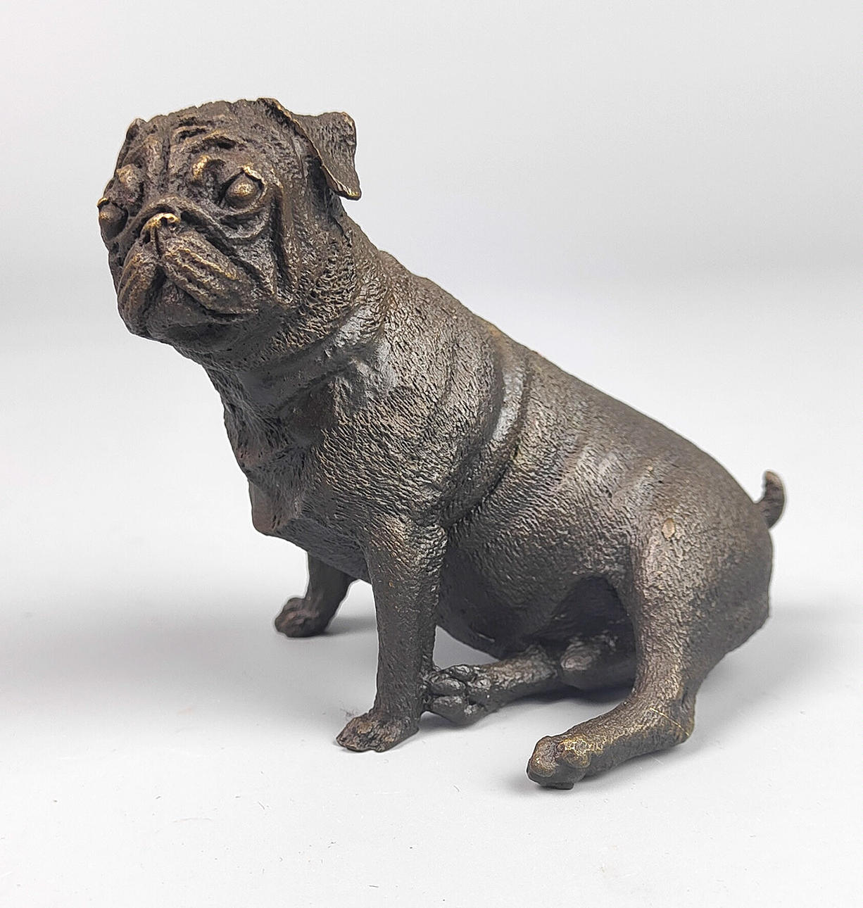 lille bronze hundefigur, højde 8,8 cm, længde ca. 10 centimeter.