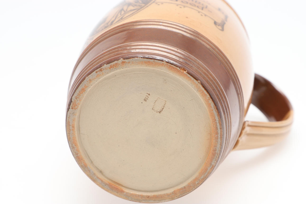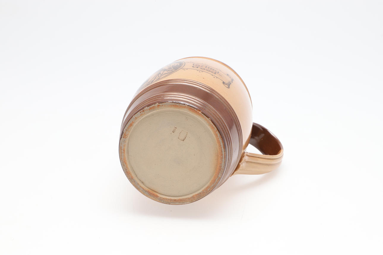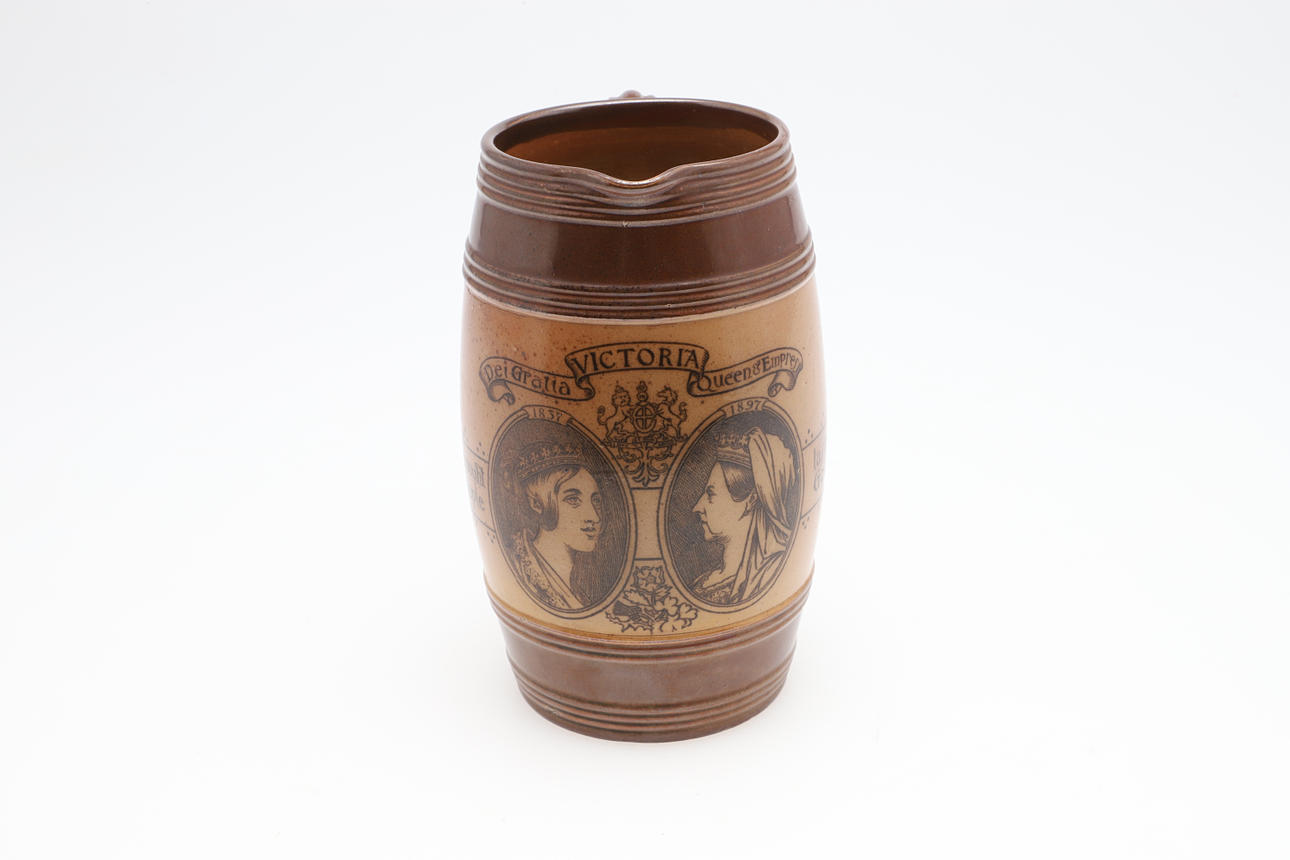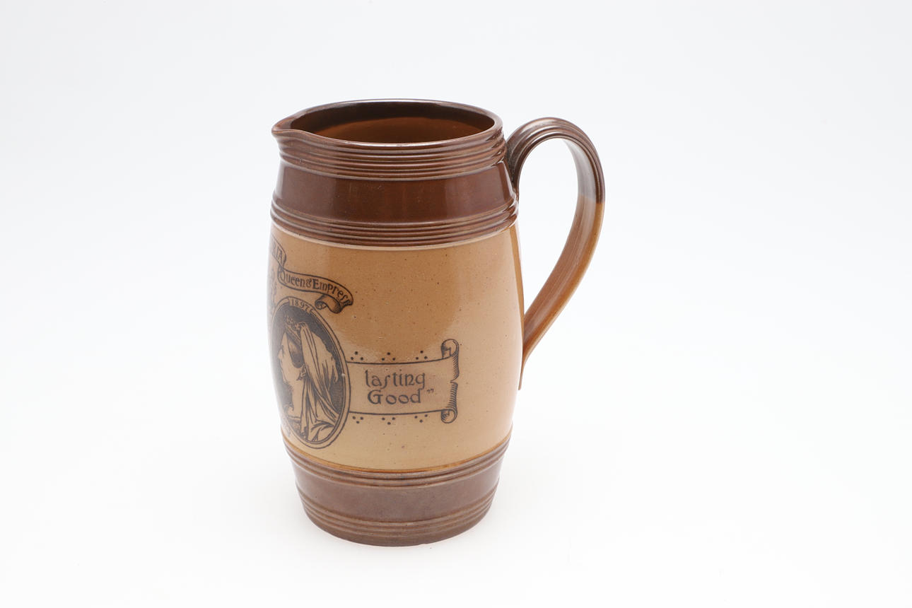 En stentøjskande lavet til DIAMANT i 1897, med titlen 'Victoria Queen & Empress'. Imponerede mærker, Doulton Lambeth. 19 cm høj.