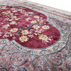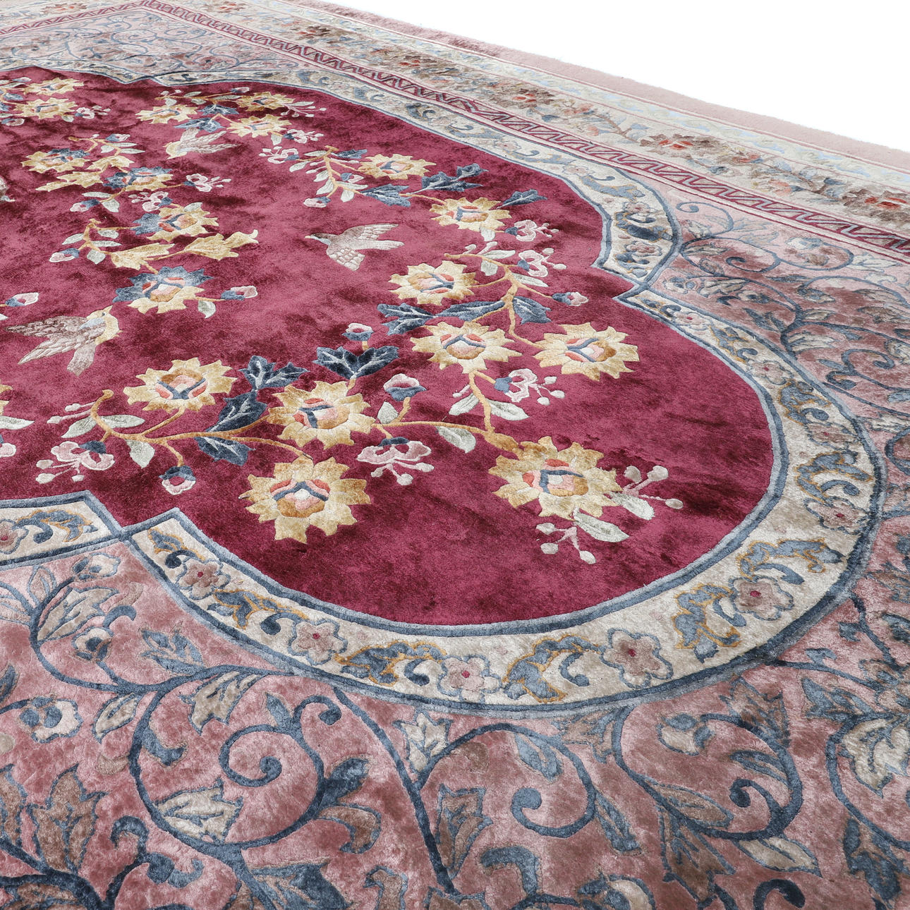 Den midterste bladdekorerede pastill på en lilla mark med lyserøde bladdekorerede kanter, 279 cm x 183 cm.