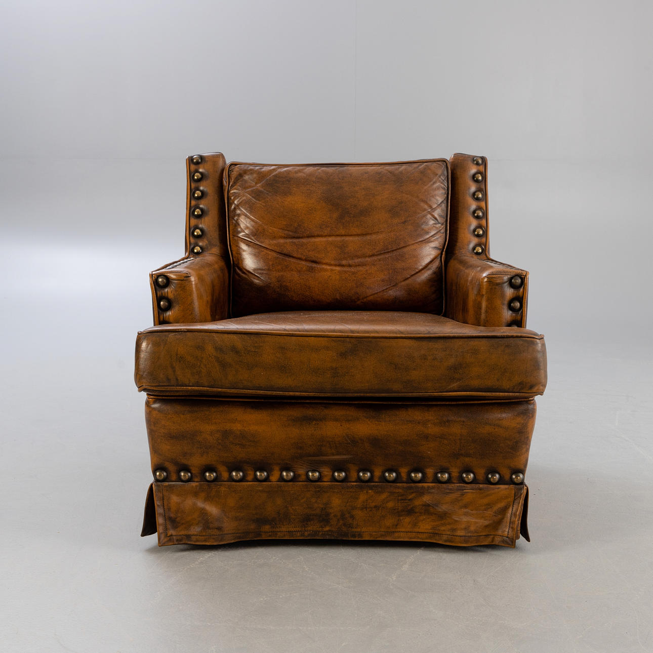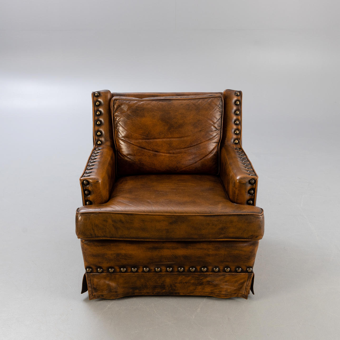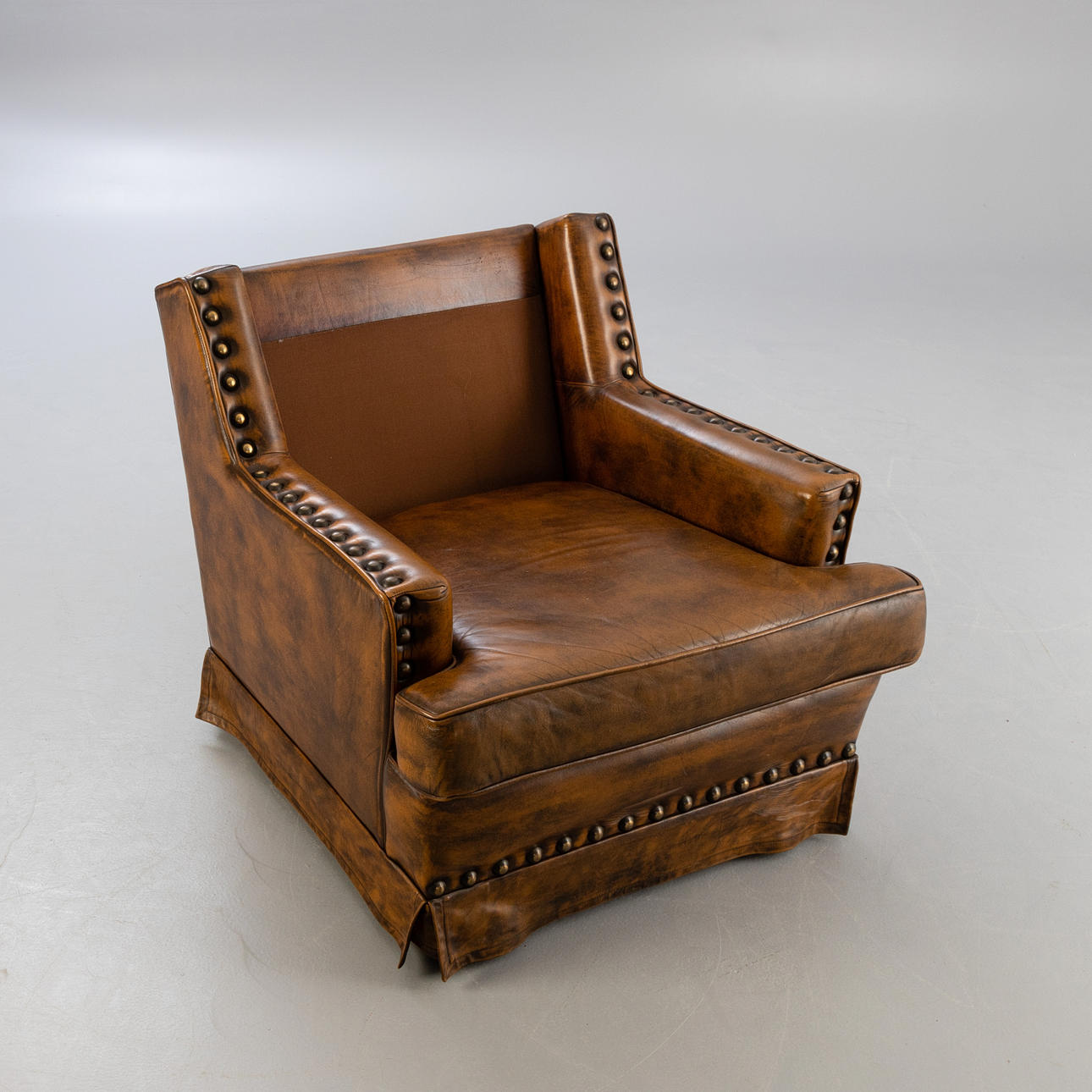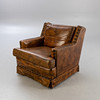 Lænestol betrukket med brunt læder. Løst sæde- og rygbetræk, sædehynde fastgjort med velcro. Kroppen er hele vejen rundt besat med store nitter.