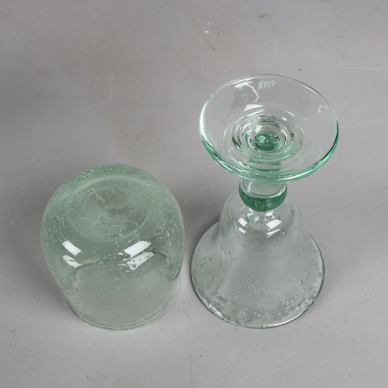 8 vinglas, 7 seltzerglas. Grønt håndblæst boblende glas. Mærket 'Biot'. H ca 8,5 - 16 cm.