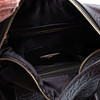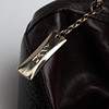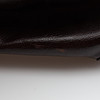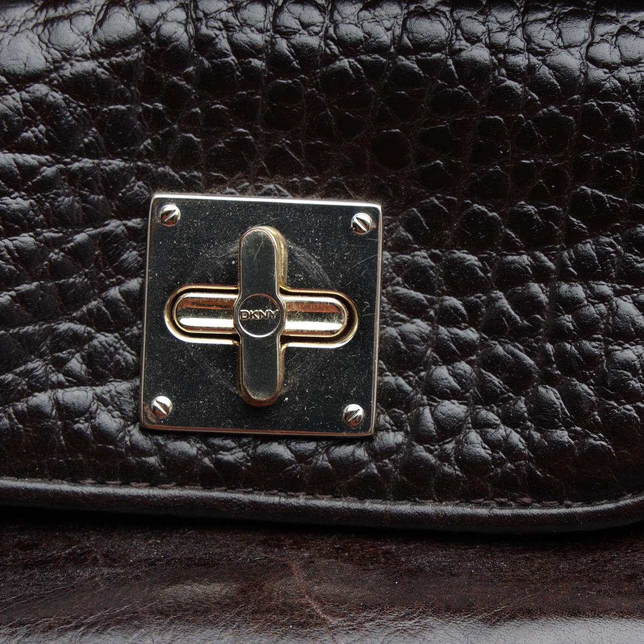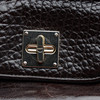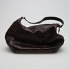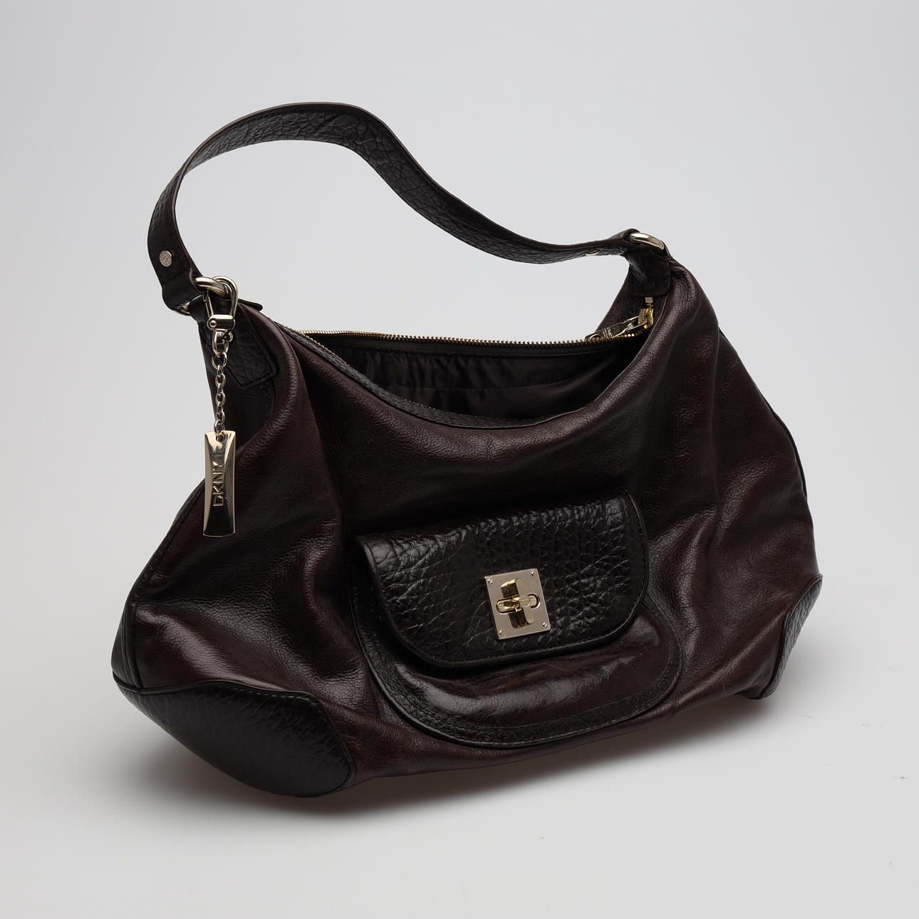 Sort læder med metaldetaljer. Mærket "DKNY" på plakette. To indvendige lommer, udstyret med lynlåse. Cirka 40 cm bred.