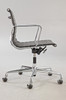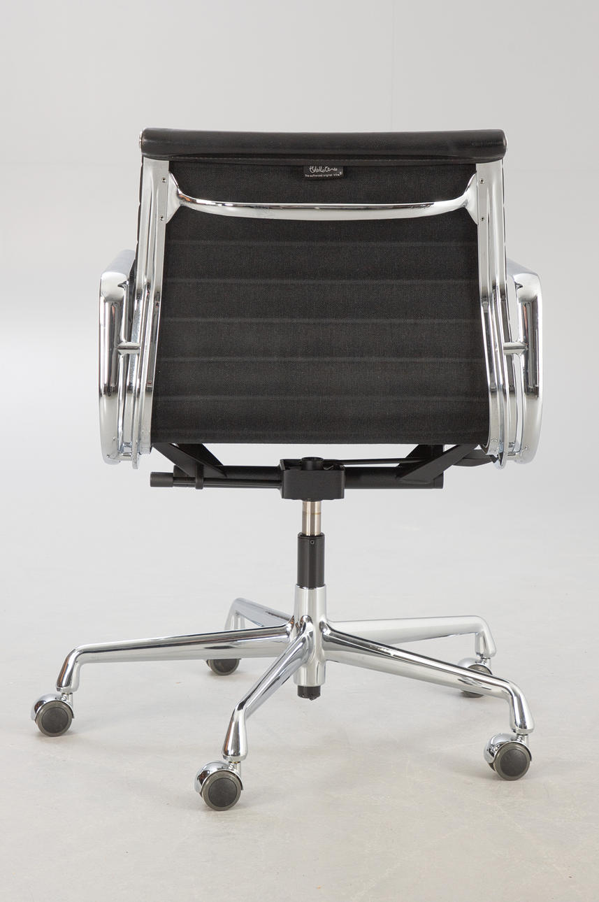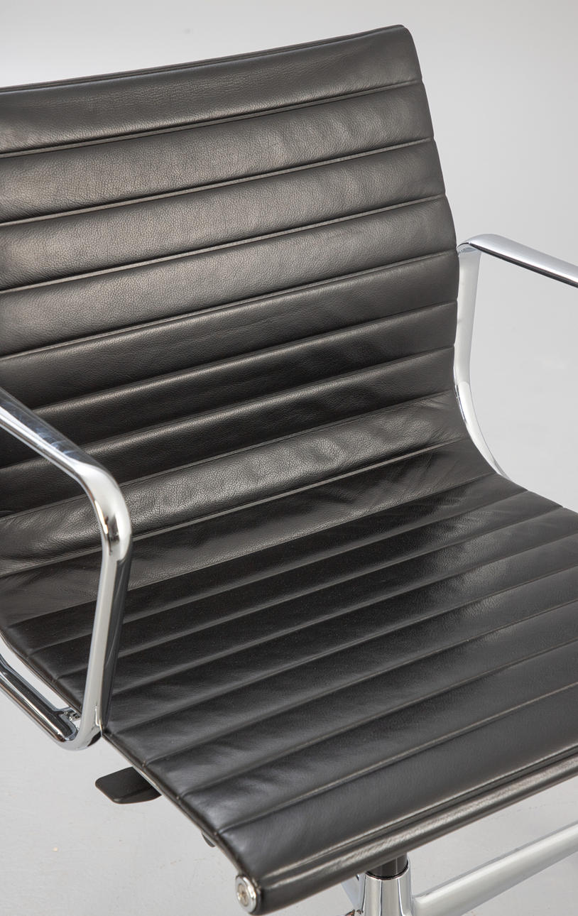 Kontorstol 'Alu Chair EA 117' fra Ray & Charles Eames, producent Vitra. Stel og armlæn i trykstøbt aluminium, pulverlakeret i sort. Sædebetræk af sort læder. Mellemhøj ryg, sædehøjde trinløst justerbar via gasfjeder. Justerbar lænemekanisme, kan låses i forreste position. Hårde gulvhjul.