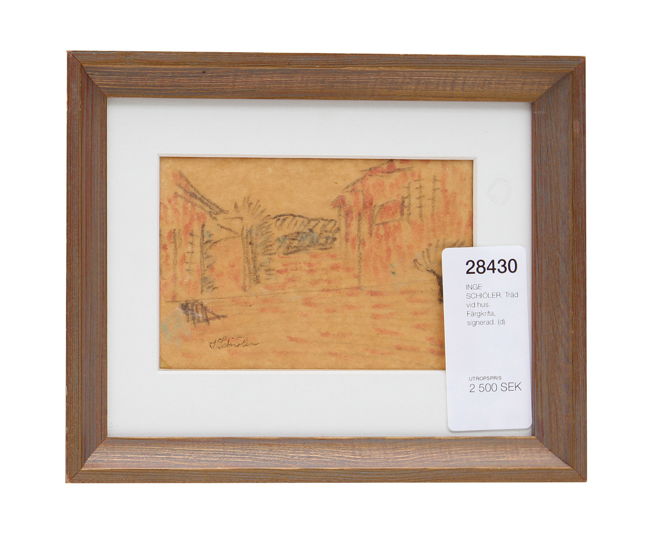 28430. INGE SCHIÖLER. Træer ved huse. Farvekridt, signeret.