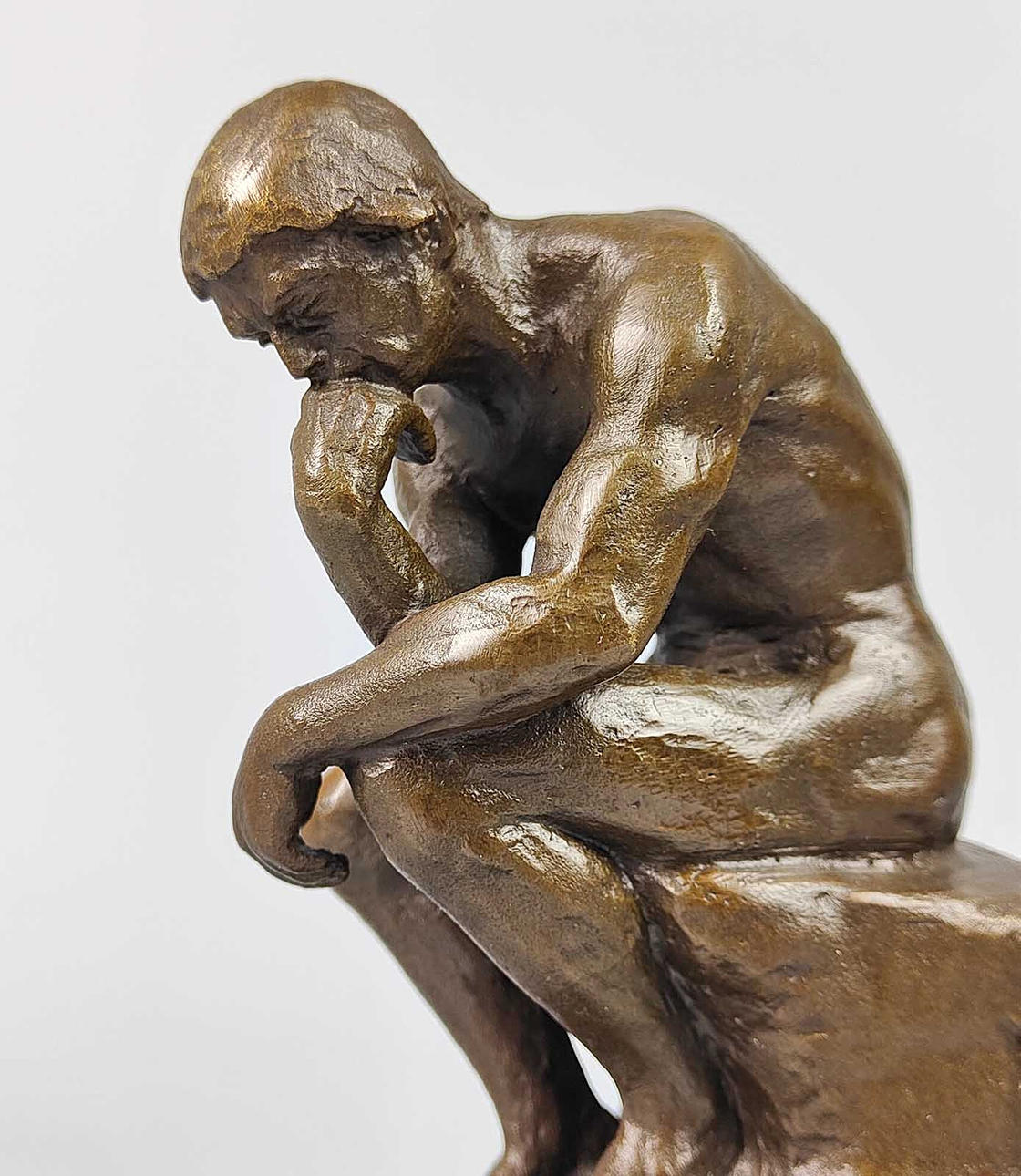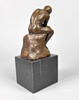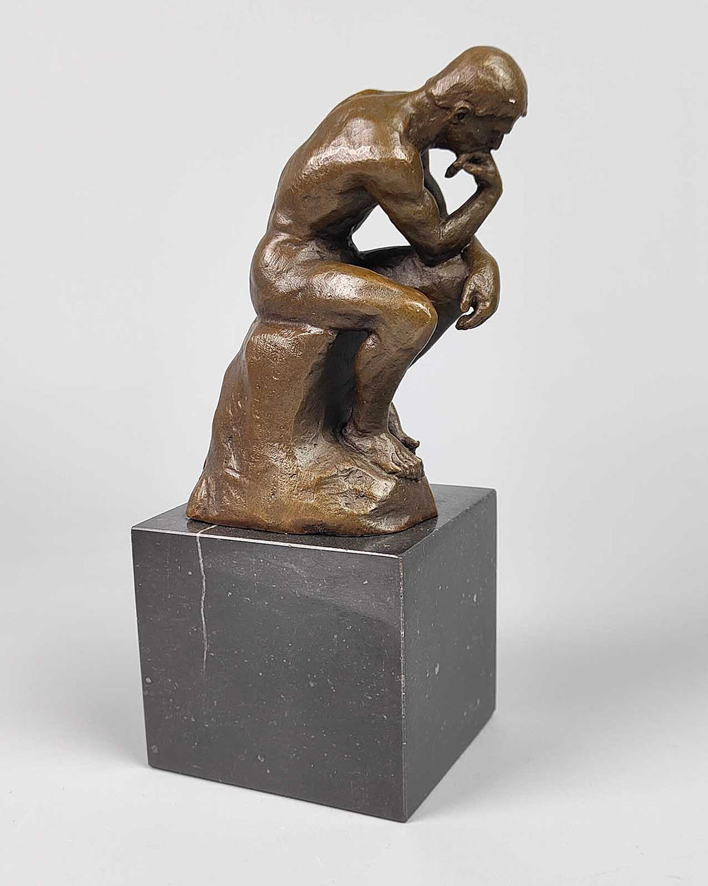 Støbt bronze, model af en nøgen mand, der støtter hovedet på den ene hånd, sidder på en klippefod og tænker, med støbeplade, efter Rodin, højde ca. 12 cm på sort marmorbund, total højde ca. 19 cm.