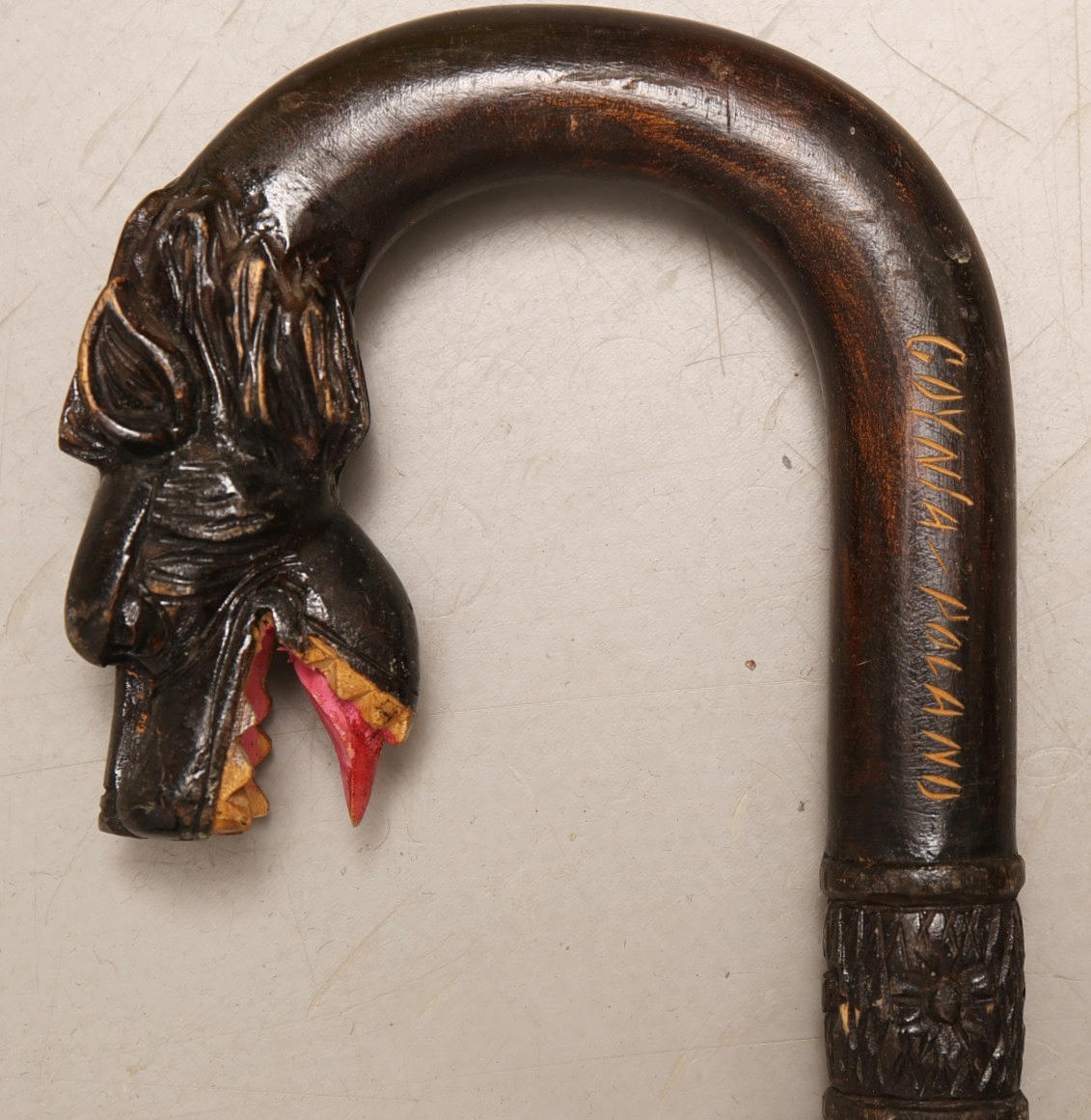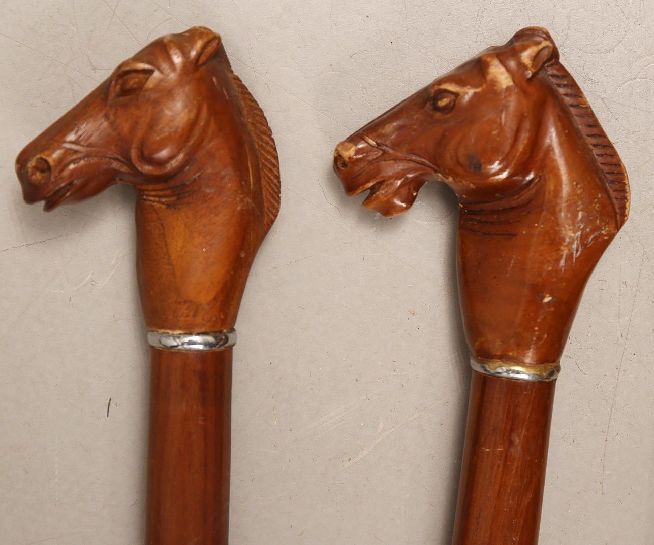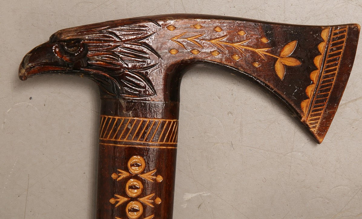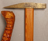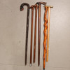 2 med hestehoved hammer med messing hoved 2 med slange og drage motiv 1 med fugl motiv længde 83-95 cm.