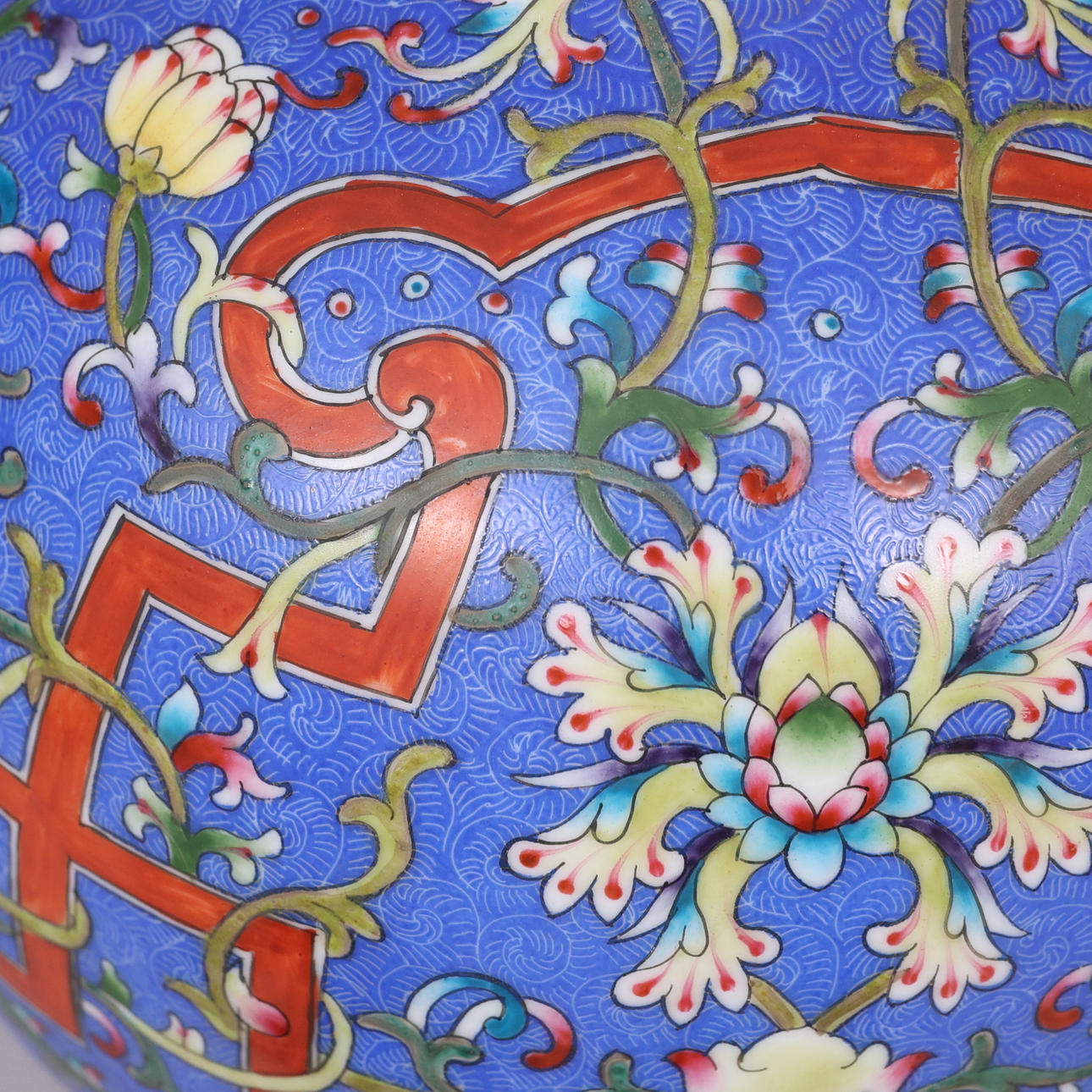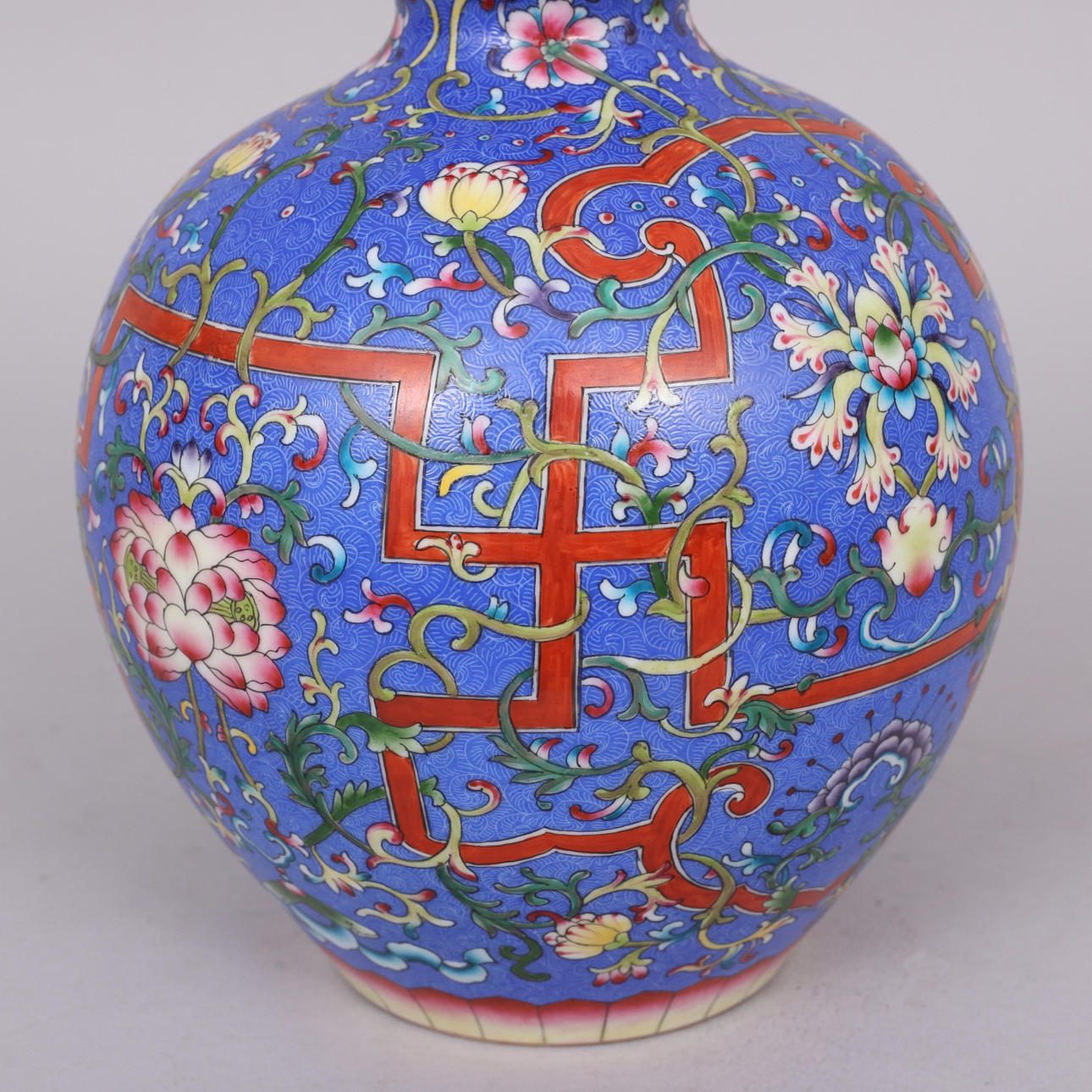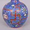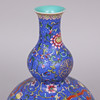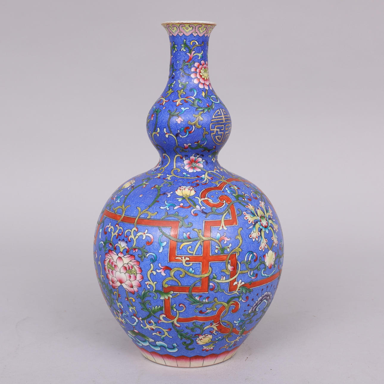 Med Qianlongs mærke. Kalebassform, dekoration i famille rose mod blå baggrund. Højde 40,5 cm.