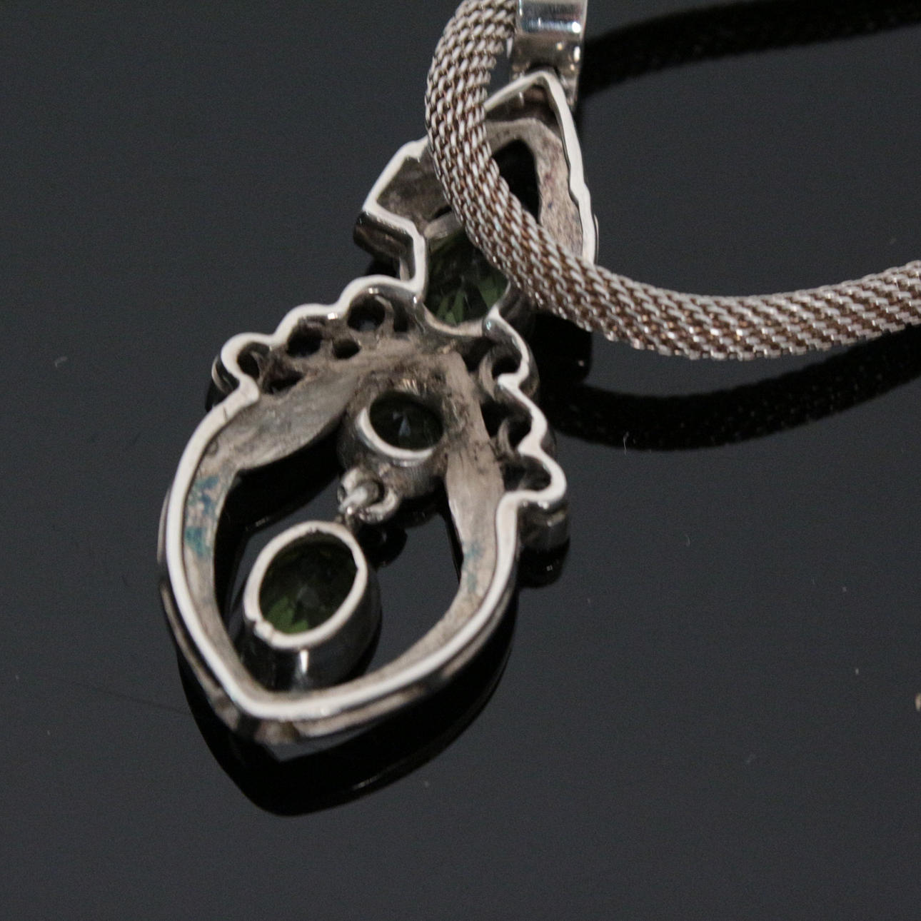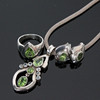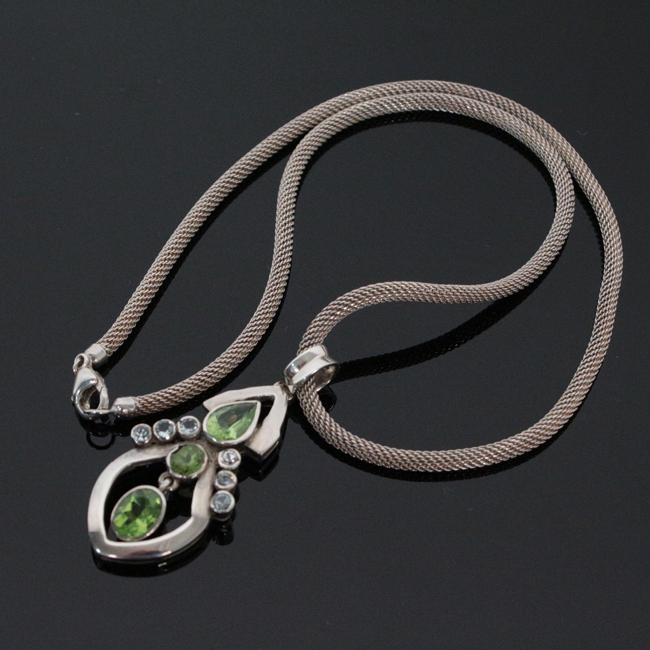 Smykkesæt med peridot, 925 sølv, sæt bestående af: - vedhæng / vedhæng med peridot (ca. 3dt.) og 6 akvamariner (0,42 ct.); - Halskæde, rund, 3,5 mm, længde: 45 cm; - ring med peridot, ringstørrelse: 57 cm; - Par ørestikker med peridot, ca. 1,10 ct.; totalvægt ca.: 38 gram.