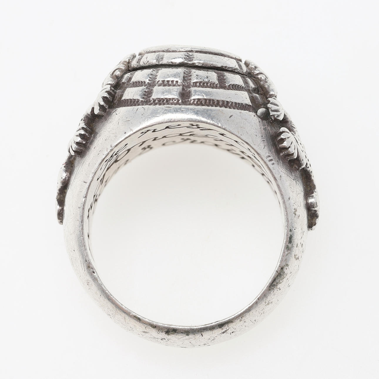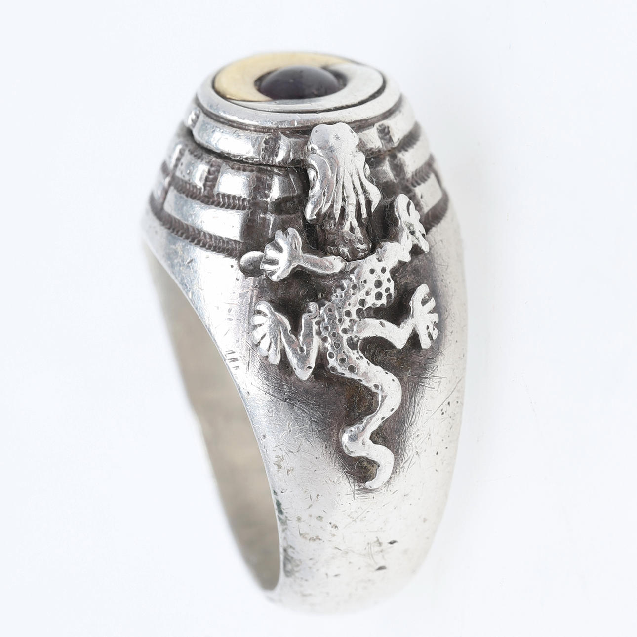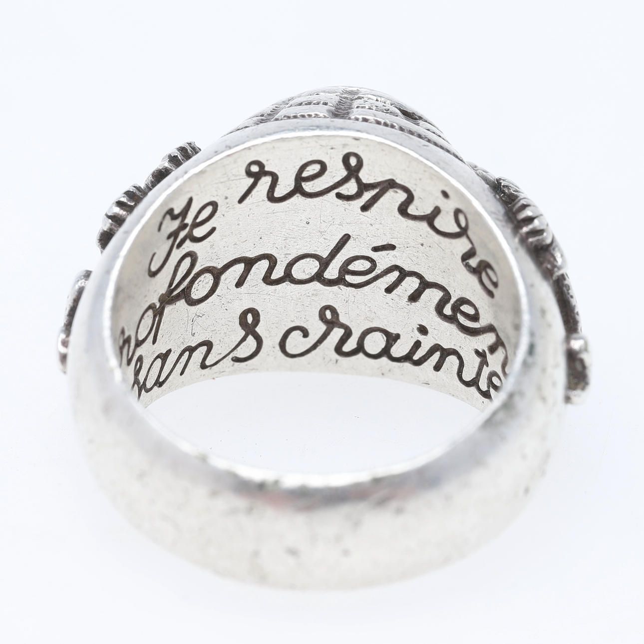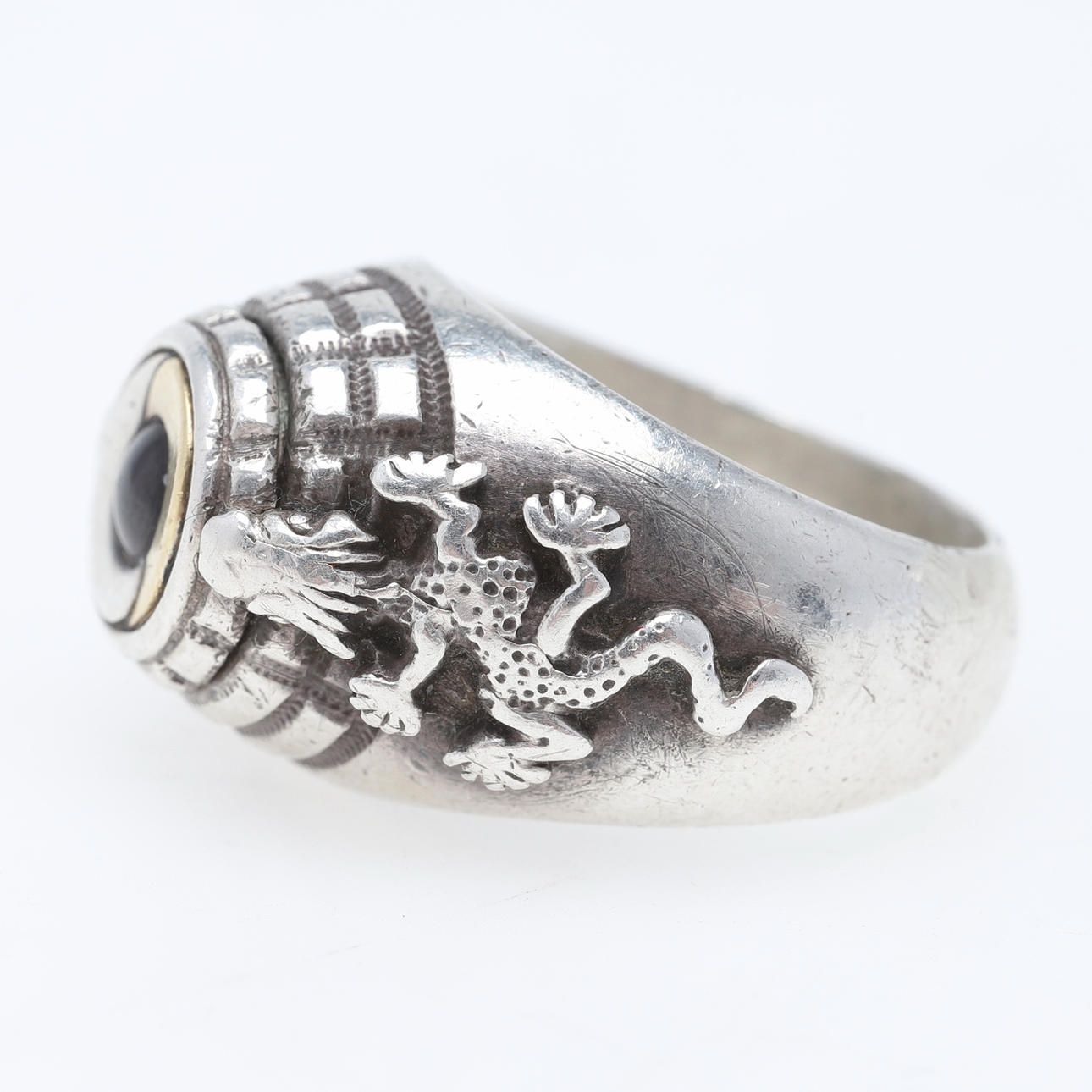 Dekoration af firben der klatrer i en pyramide, inde i ringen en skrift på fransk "je respire profoundly et sans sainte" Ringstørrelse ca 19,5 / 61 Bredde ca 7,7-17 mm, højde ca 9,3 mm Vægt ca 25,3 gram.