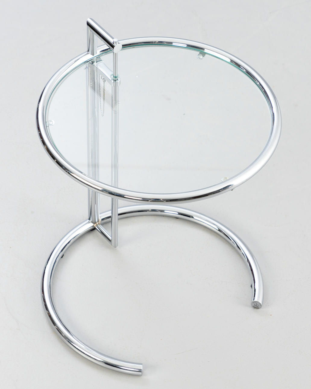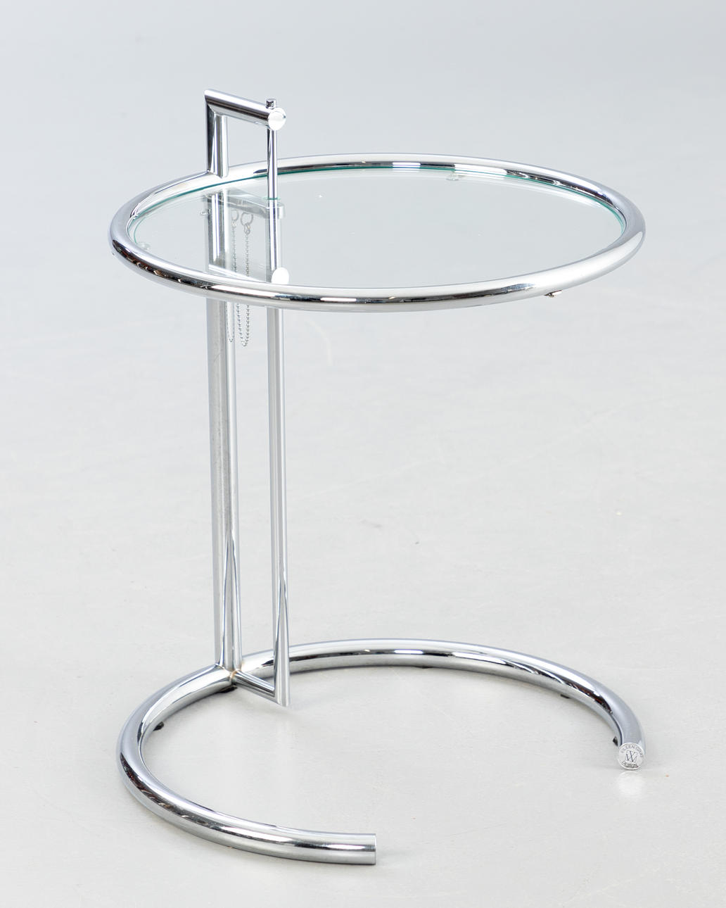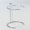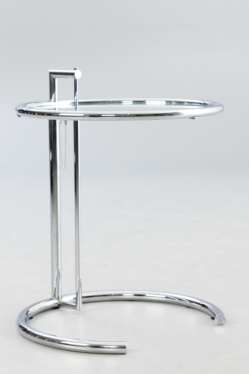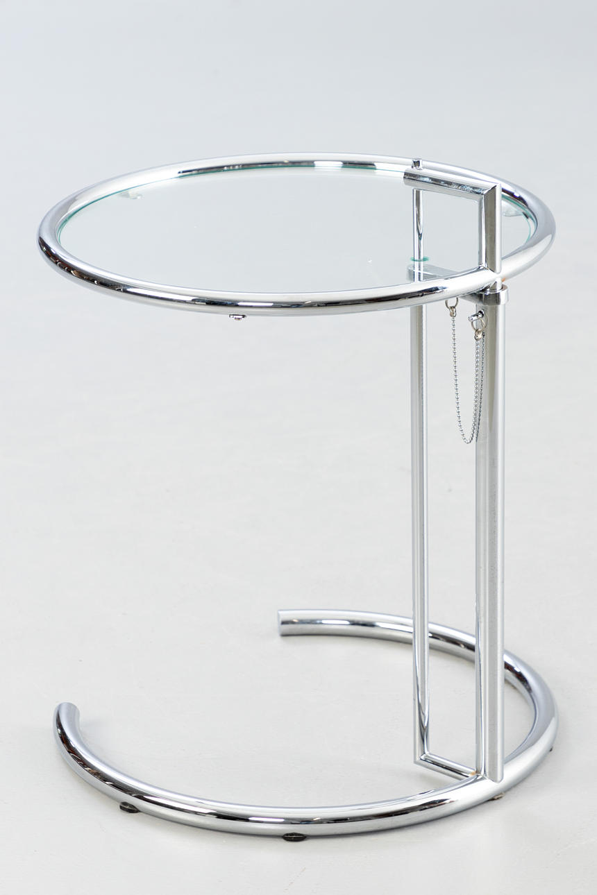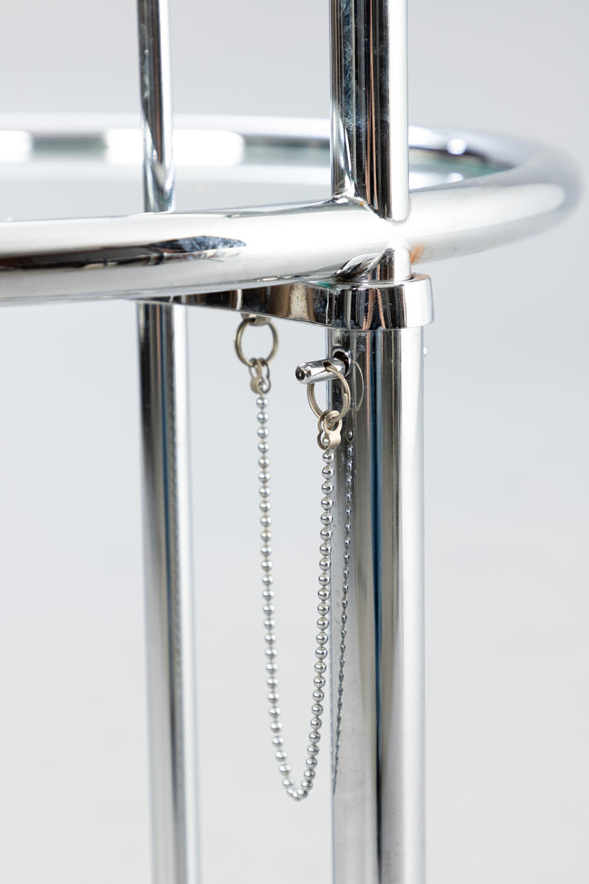 'Justerbart bord E1027' af Eileen Gray, fremstillet United Workshops for Craftsmanship, München, midten af det 20. århundrede. Udkast: 1927. Stel af forkromet metal, top af krystalglas. Mærket med producentmærkat på foden.