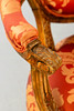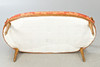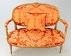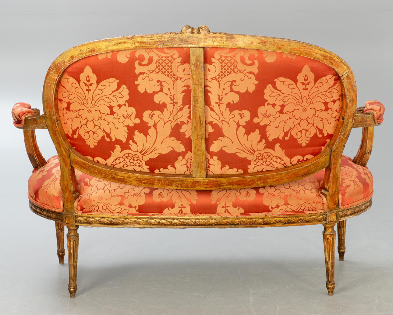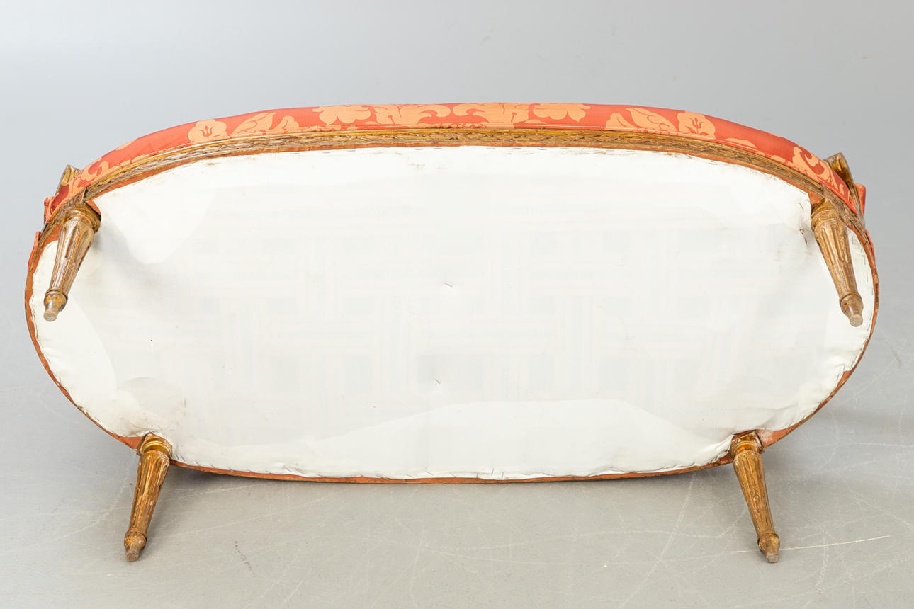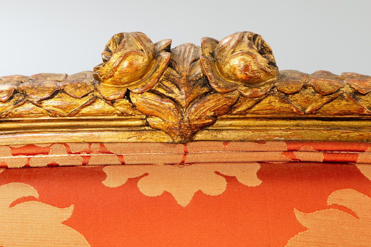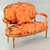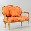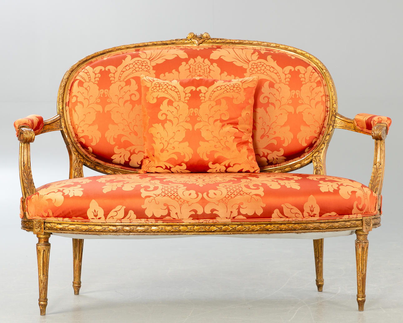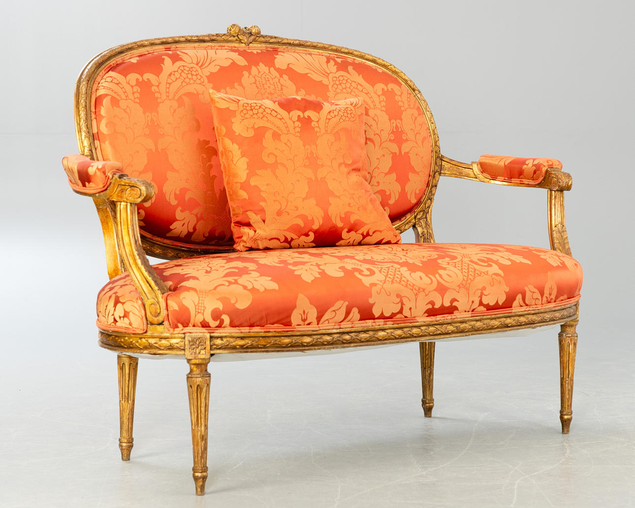 Træramme, forgyldt og bronzeret på kridtbaggrund, udskårne dekorationer. Fuldpolstret sædestel og ryg i rektangulær form med afrundede smalle sider på tilspidsede, riflede ben. Udskæring i form af krydsbånd, akantusblade og kronende rosenblade. Tekstilbetræk i rødt med granatæblemønster i guld. HxShxBxD: ca. 100x46x136x50 cm.