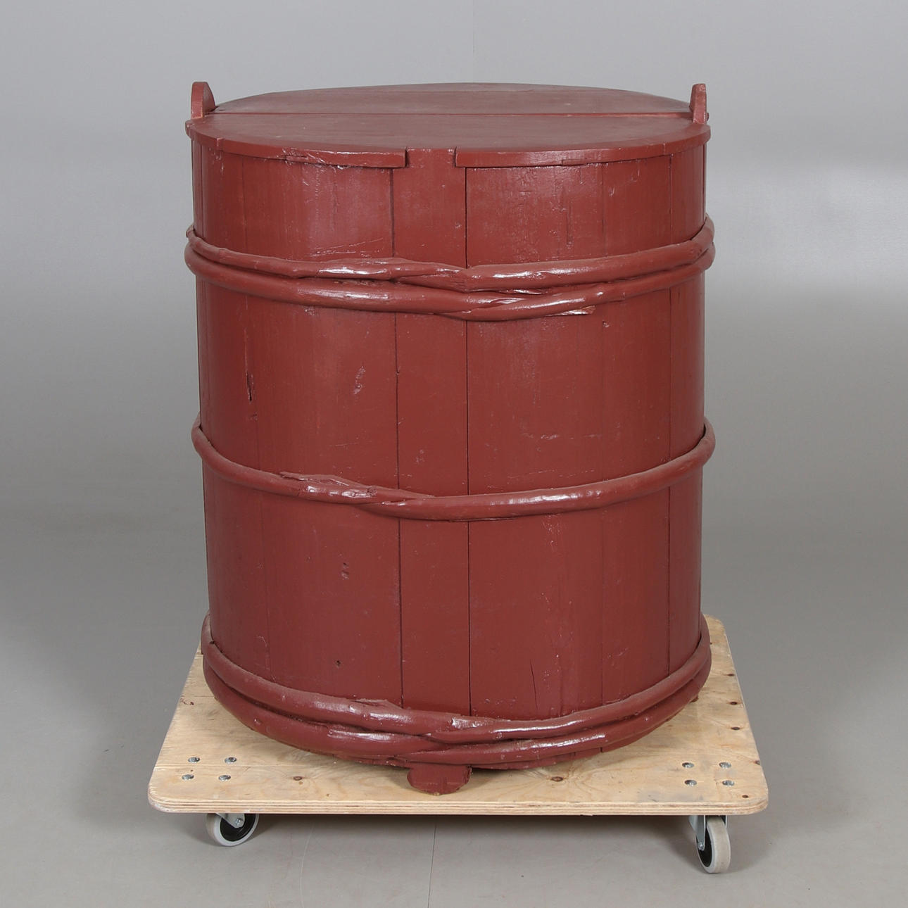 Brug og aldersrelateret slid. Senere malet. Revner mellem lagene.