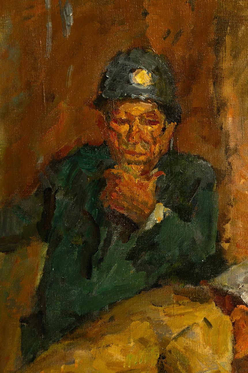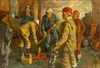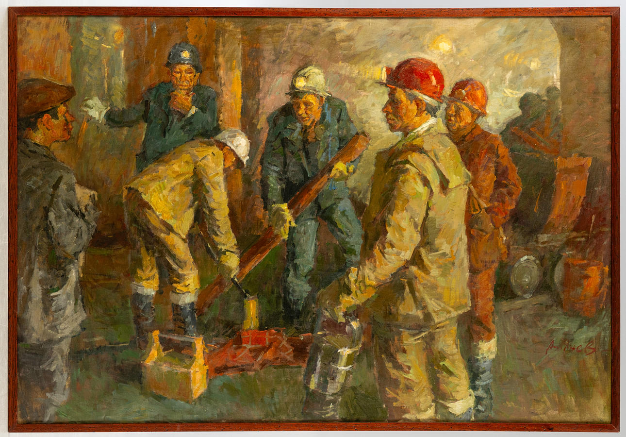 Anatoly Nikitovich Janev (f. 1945), Die Metro-Ingenieure, olie på lærred, 1980'erne, signeret nederst til højre, signeret, betitlet og indskrevet på russisk på bagsiden, med en smal studiestrimmel ca. 107x146 cm.