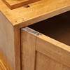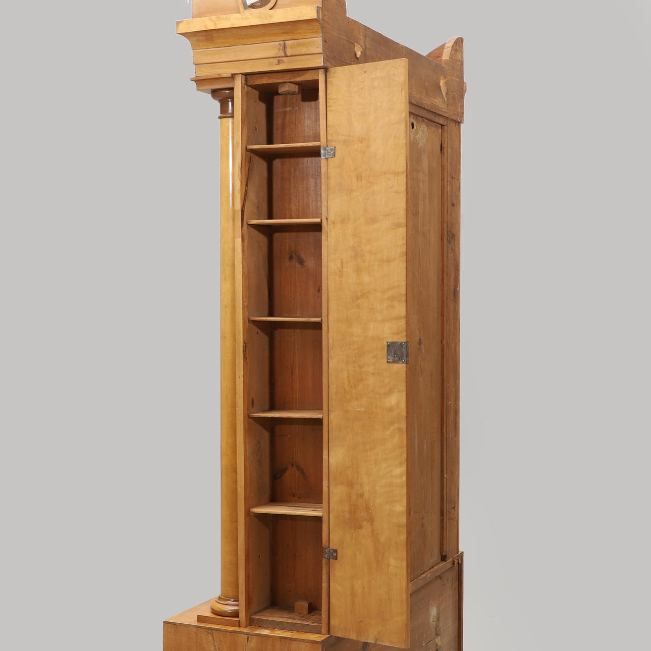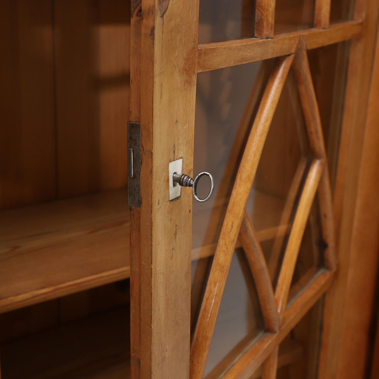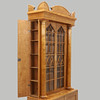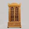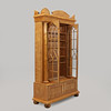Udbenet birk. Justerbare hylder bag glasdøre. Hylder bag låger i siderne. Højde 210, bredde 117, dybde 48 cm.