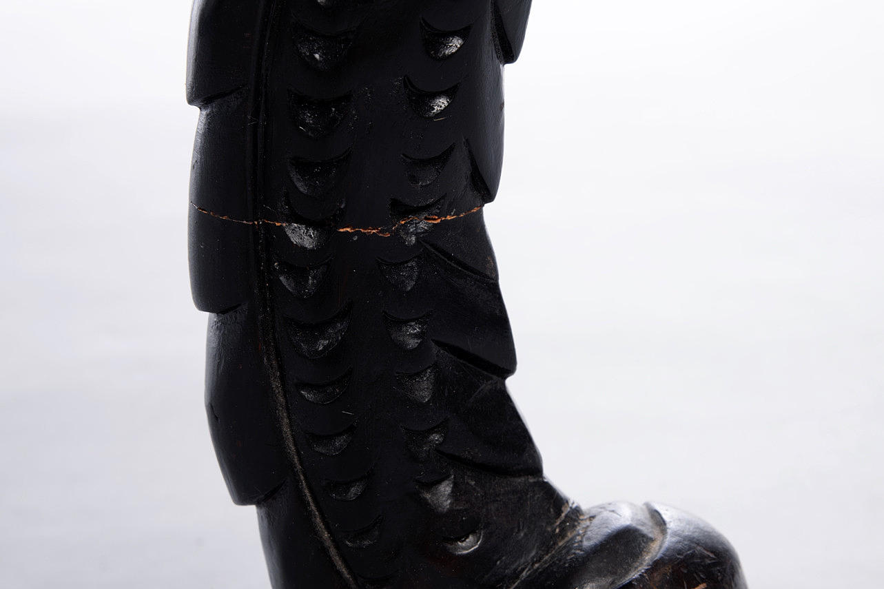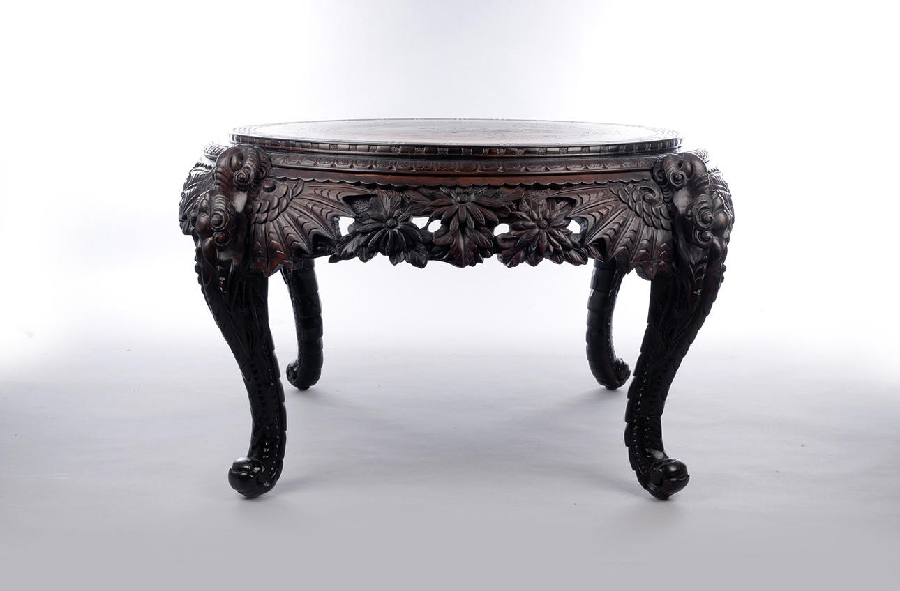 Rig, plastisk udskåret indretning i mørkt træ, bordplade med en vridende drage, formentlig 1. Halvdelen af det 20. århundrede. mål ca. 110x60 cm.