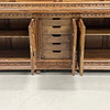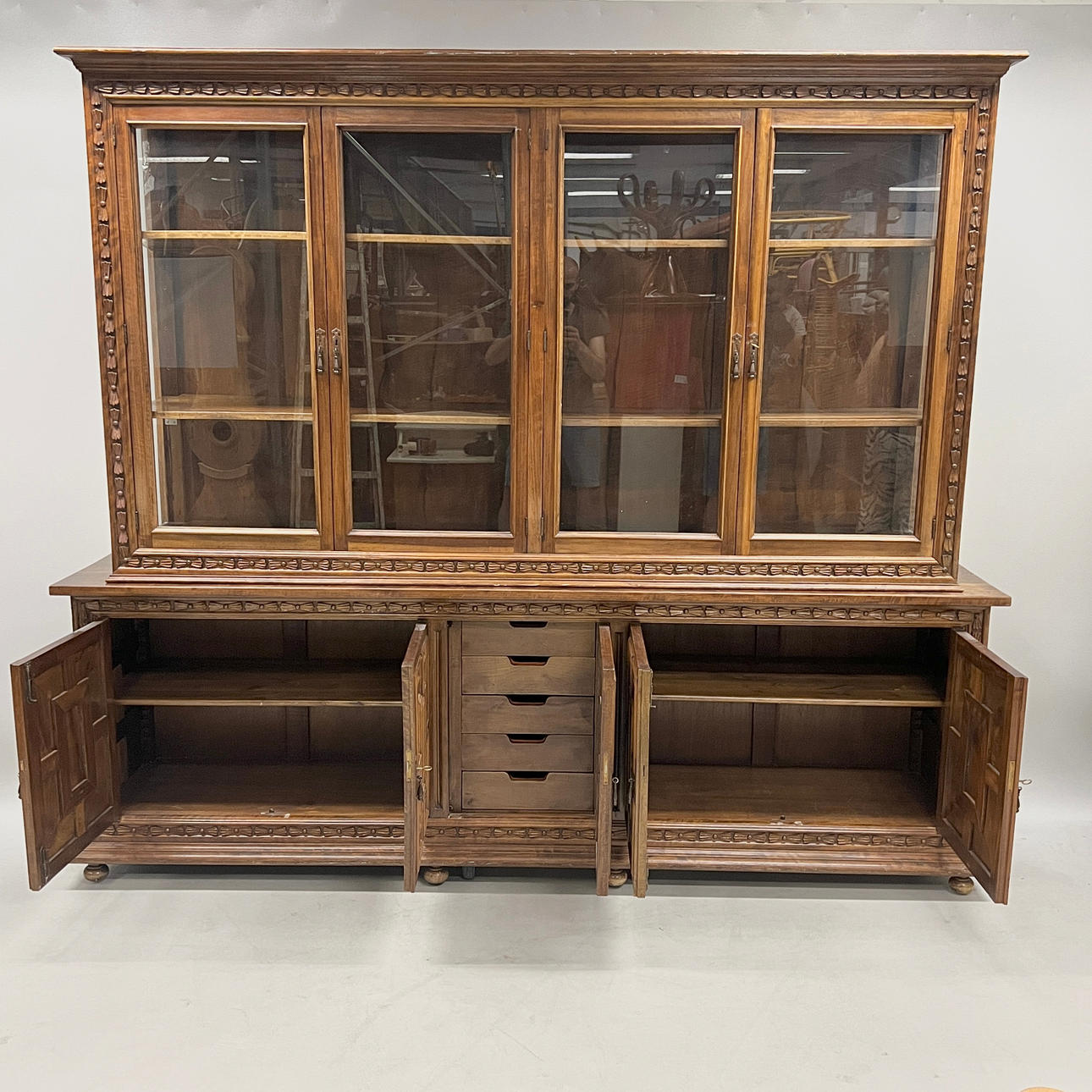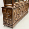 Todelt skab. Stel af mørkbejdset træ. Overdel med to par låger og underliggende hylder. Underdel med to par låger og en enkelt låge med underliggende skuffer. Bredde 252, dybde 52 cm, højde 220 cm.