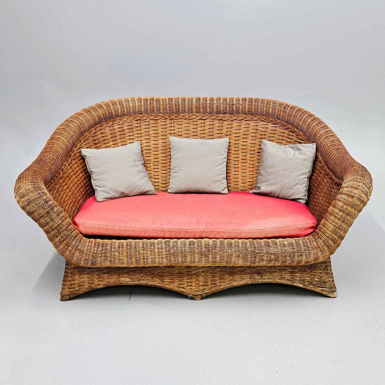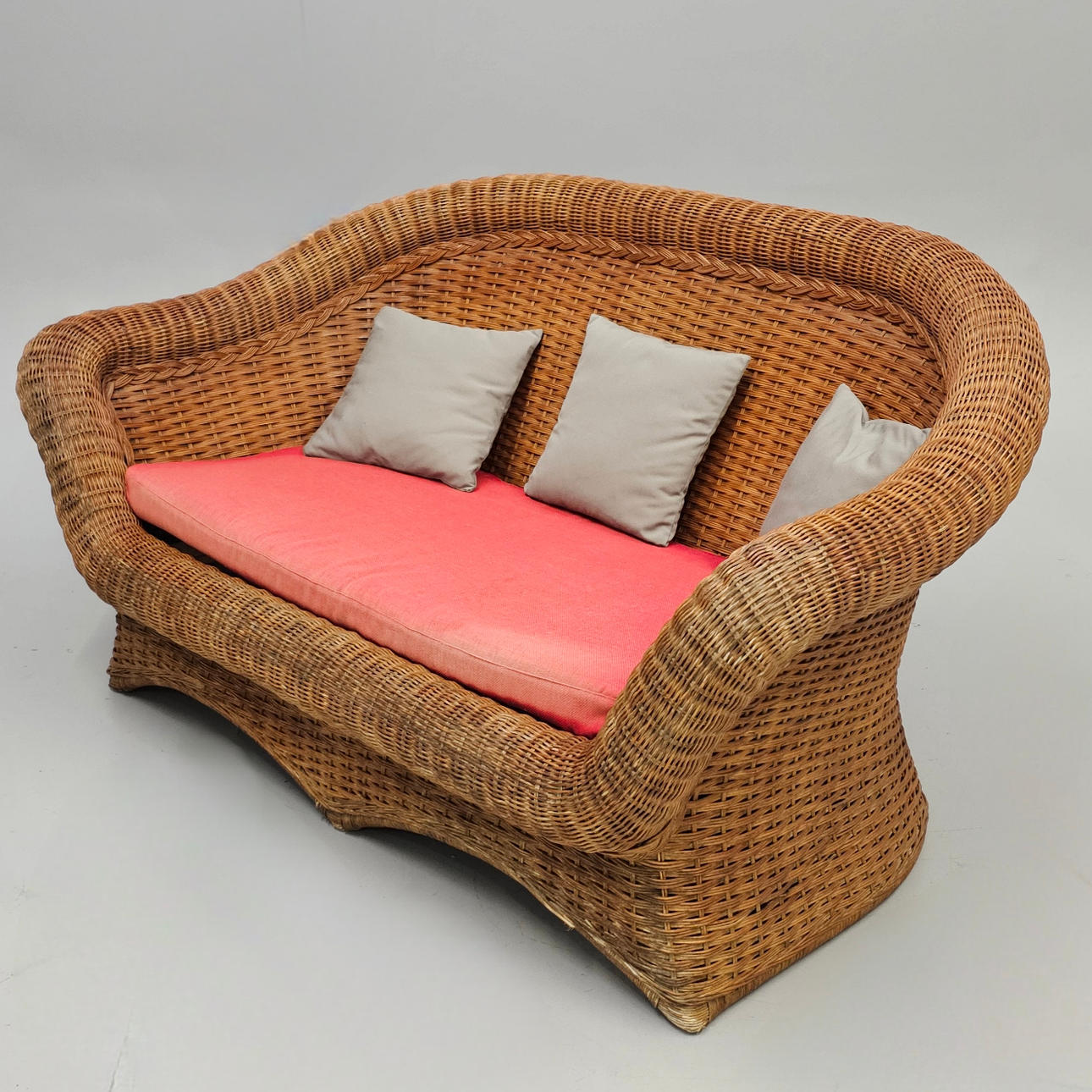 2903619. FLET HAVESOFA MED RØDE PUDER.