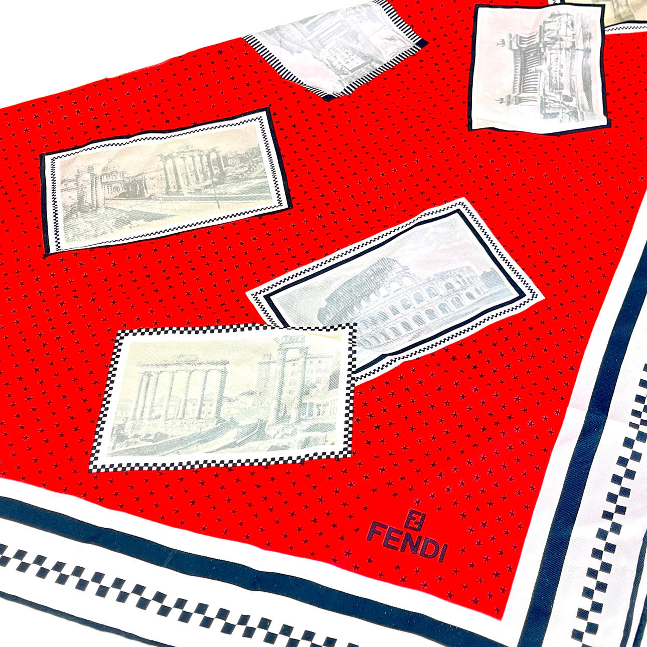 Et vintage Fendi-tørklæde med fotografier, der viser monumenter, 85,5 x 82,5 cm.
