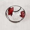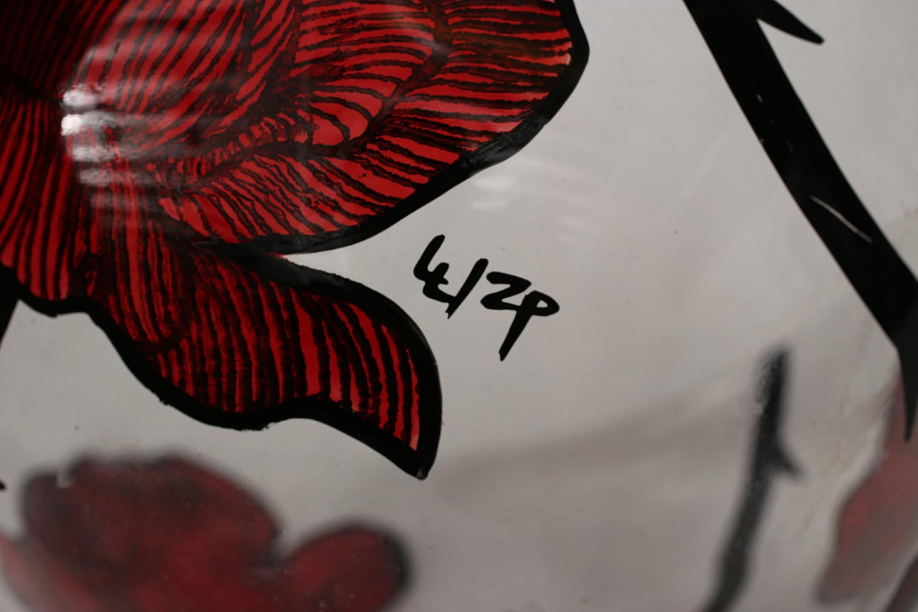 Skål, med maleri på ydersiden i form af tre store røde roser, buede sorte stængler med torne, forsynet med dobbelt monogram signatur på siden, og under bunden indgraveret L Löfgren 7051007 Højde ca 12 cm Diameter ca 22 cm.