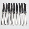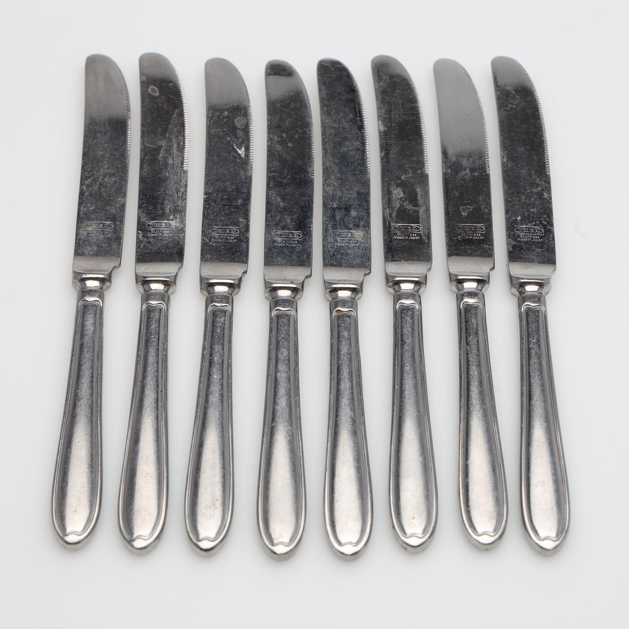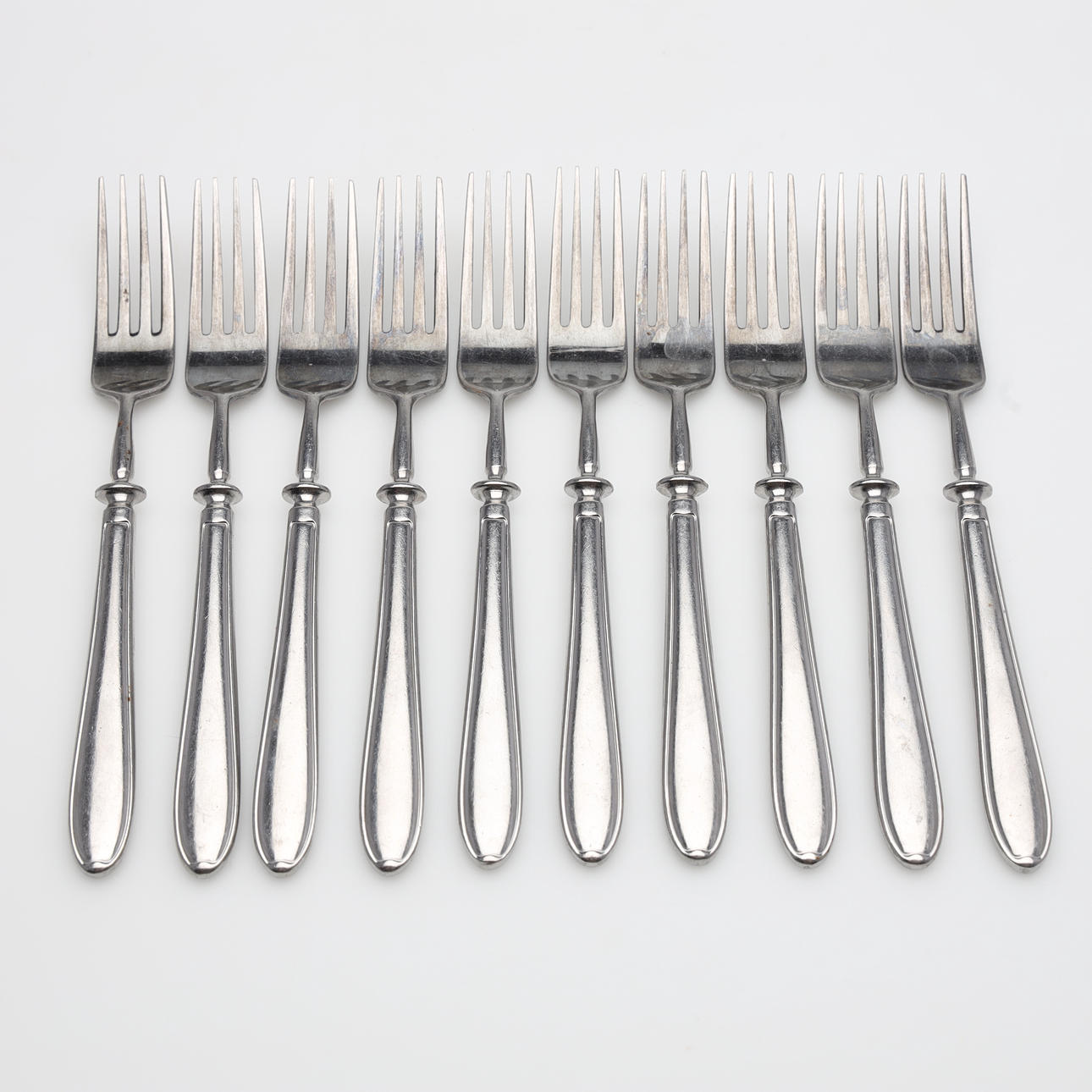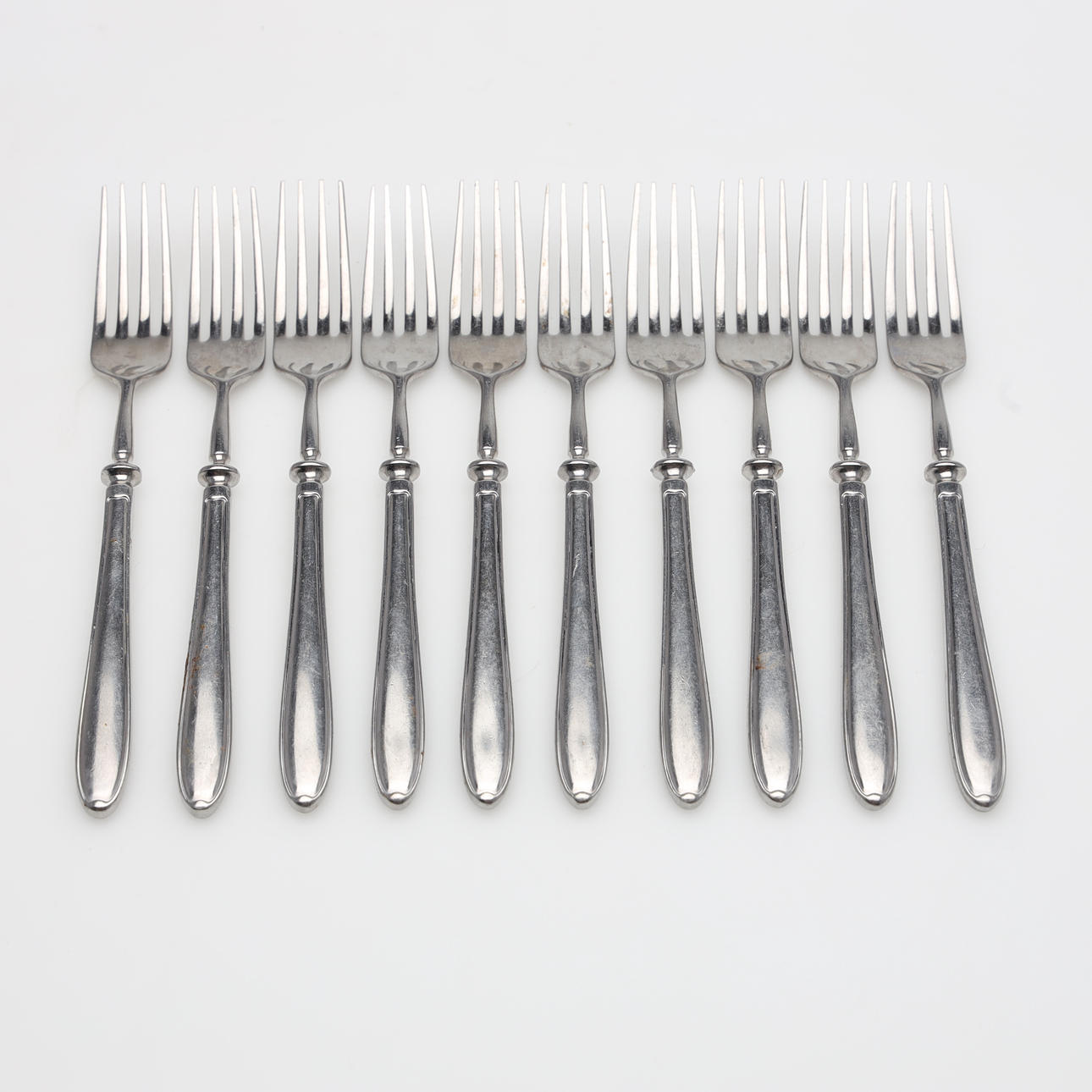 10 gafler ca 20cm 10 gafler ca 16,5cm 10 skeer ca 20cm 7 skeer 16cm 5 kaffeskeer ca 12,5cm 9 knive ca 21,5cm 8 knive ca 18cm.