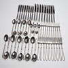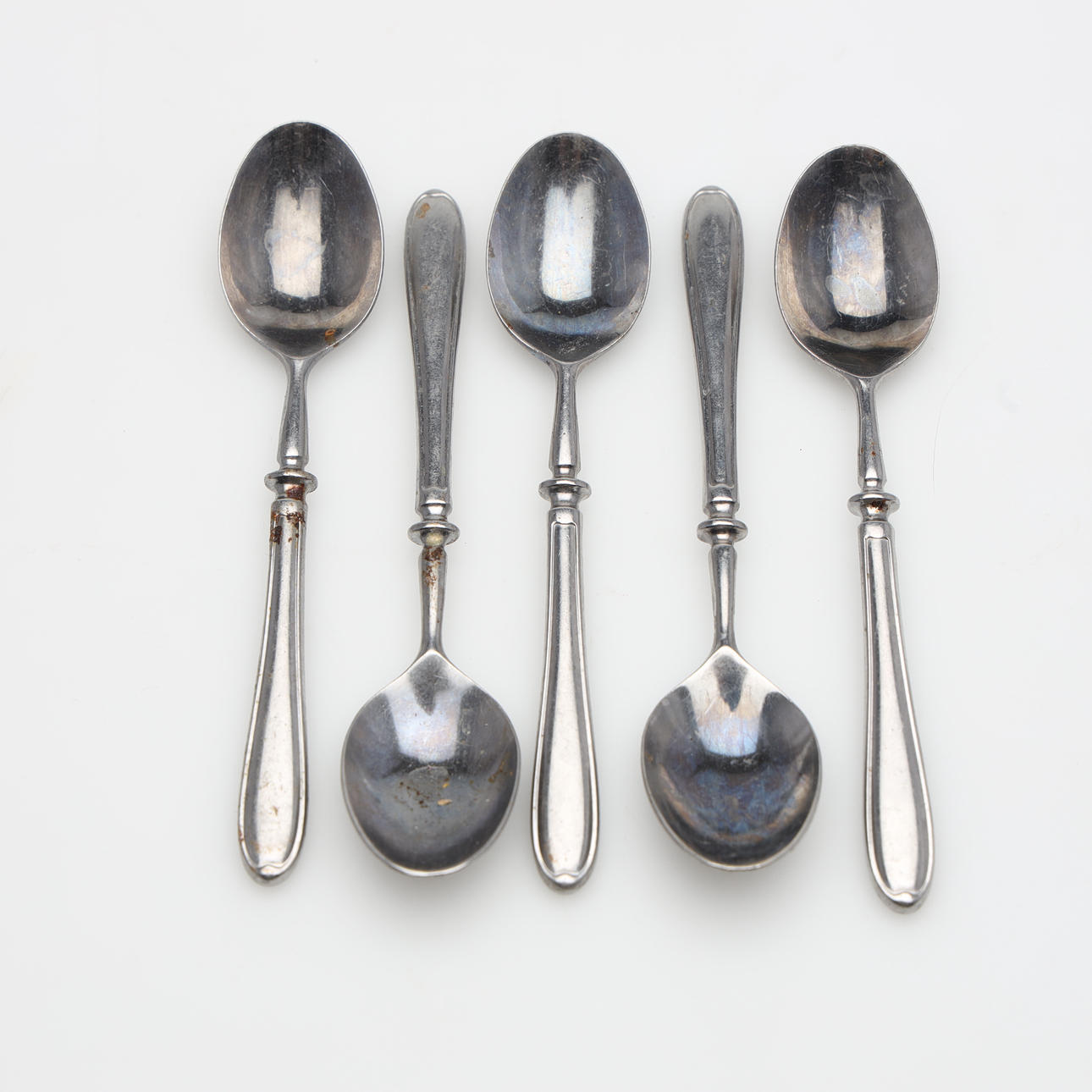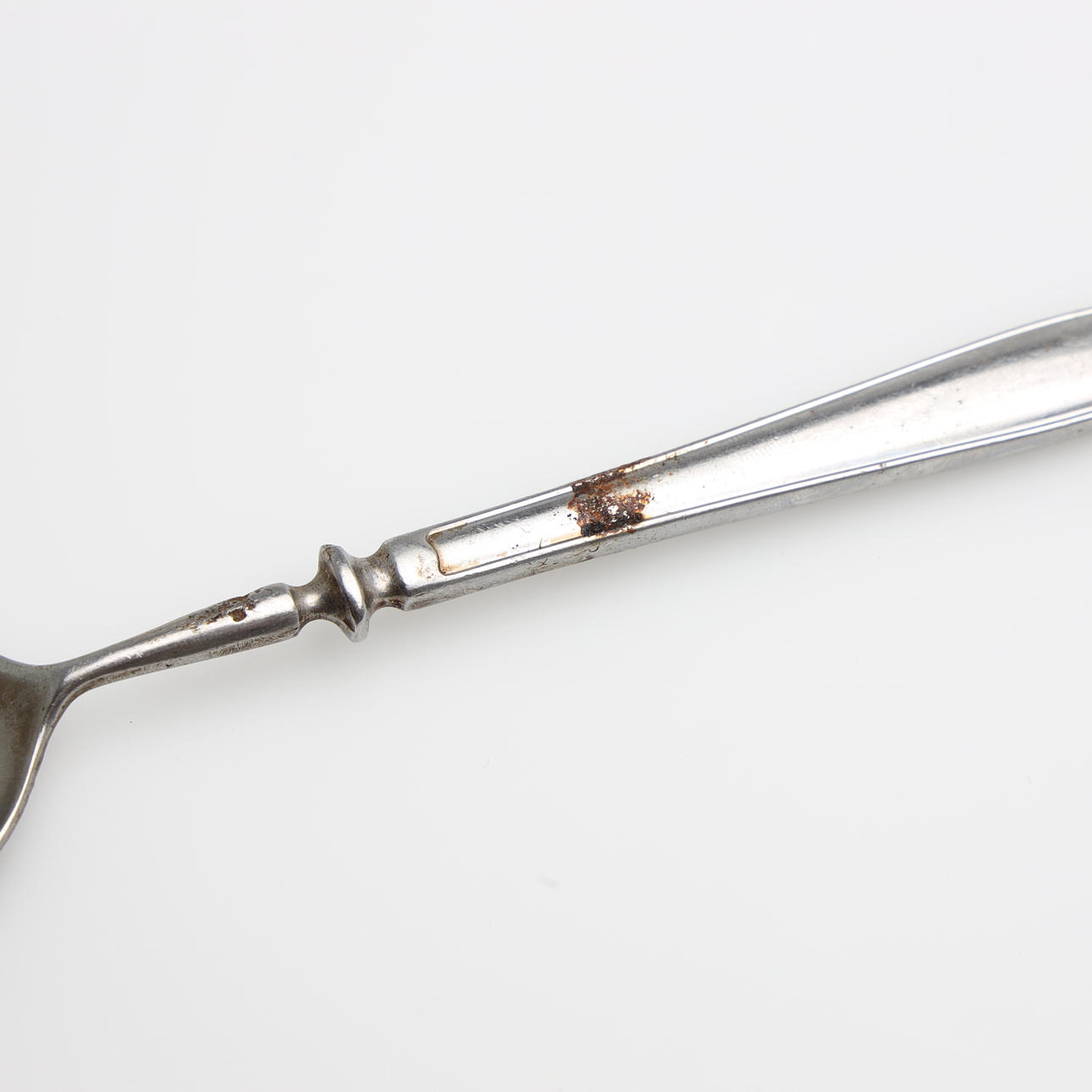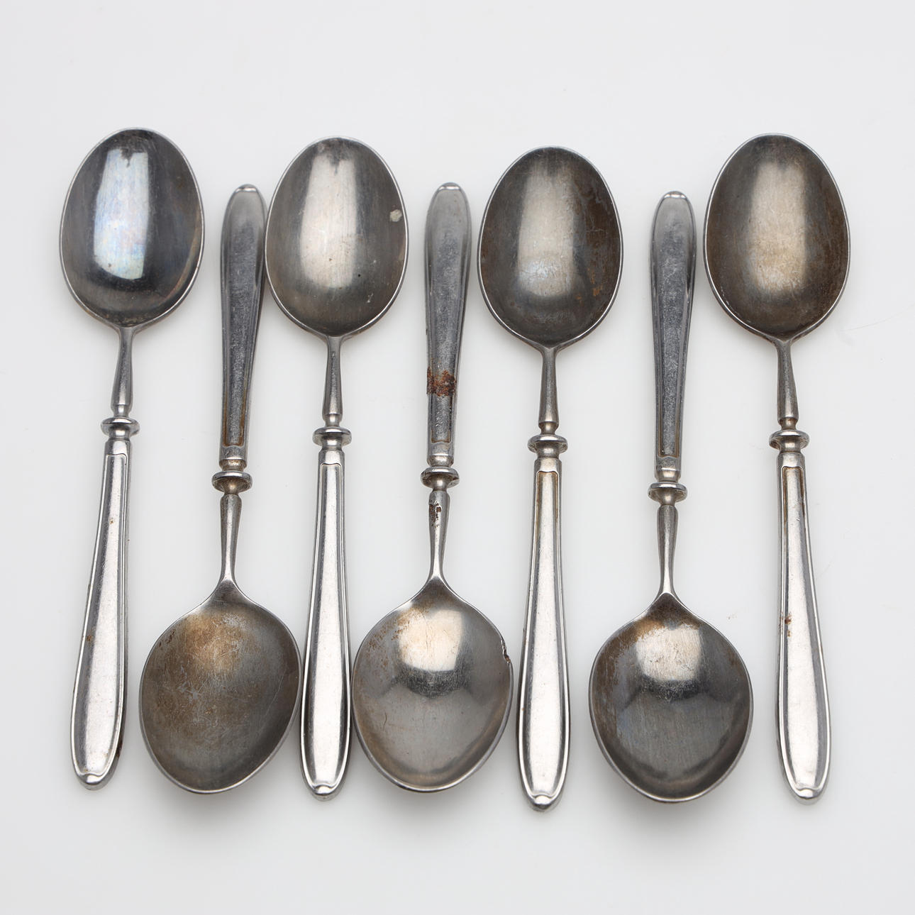 10 gafler ca 20cm 10 gafler ca 16,5cm 10 skeer ca 20cm 7 skeer 16cm 5 kaffeskeer ca 12,5cm 9 knive ca 21,5cm 8 knive ca 18cm.