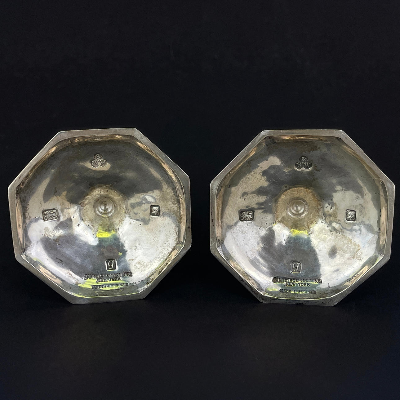 Et par tunge engelske stemplede sølv lysestager lavet til James Robinson fra New York, H. 10cm.