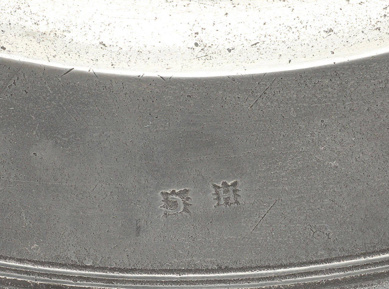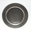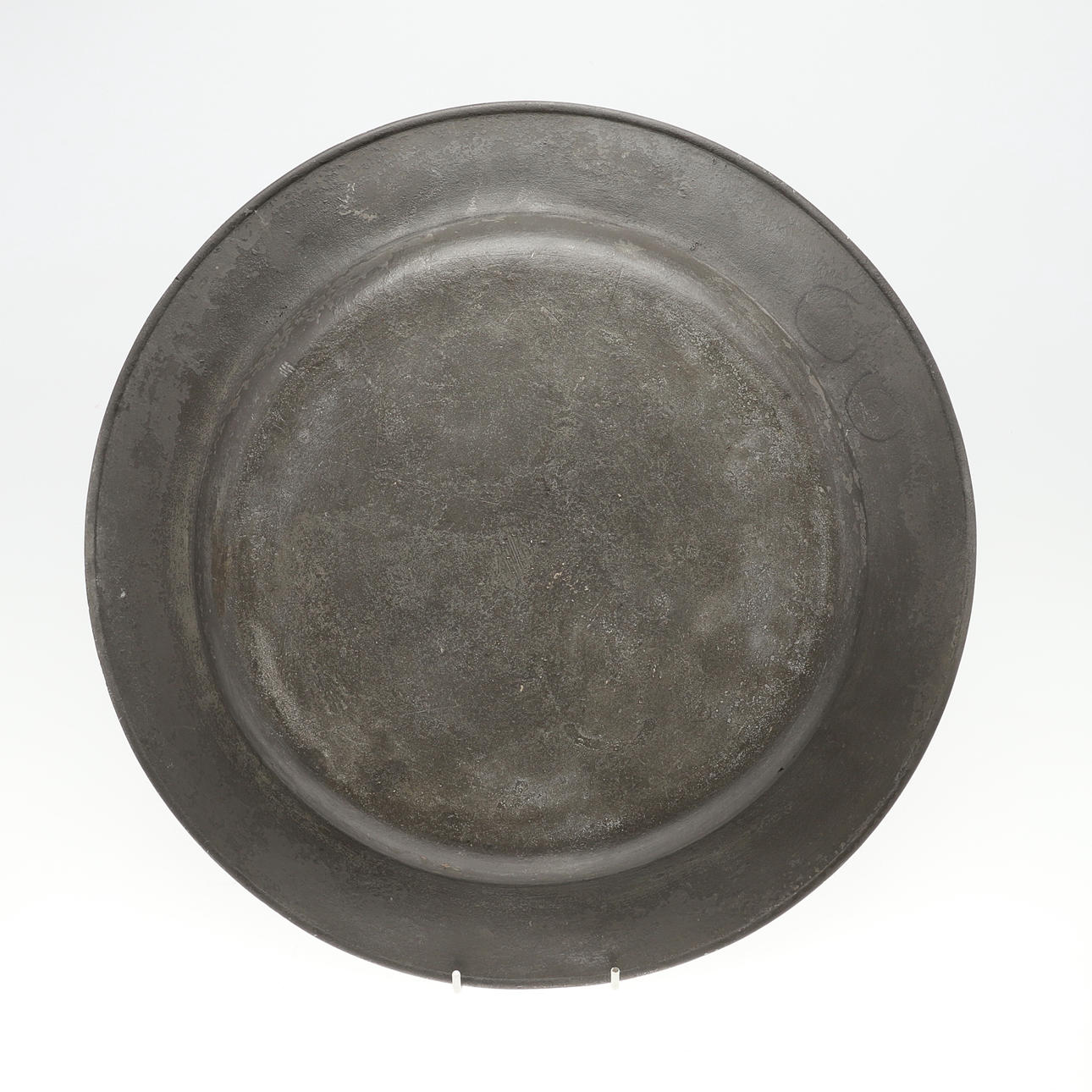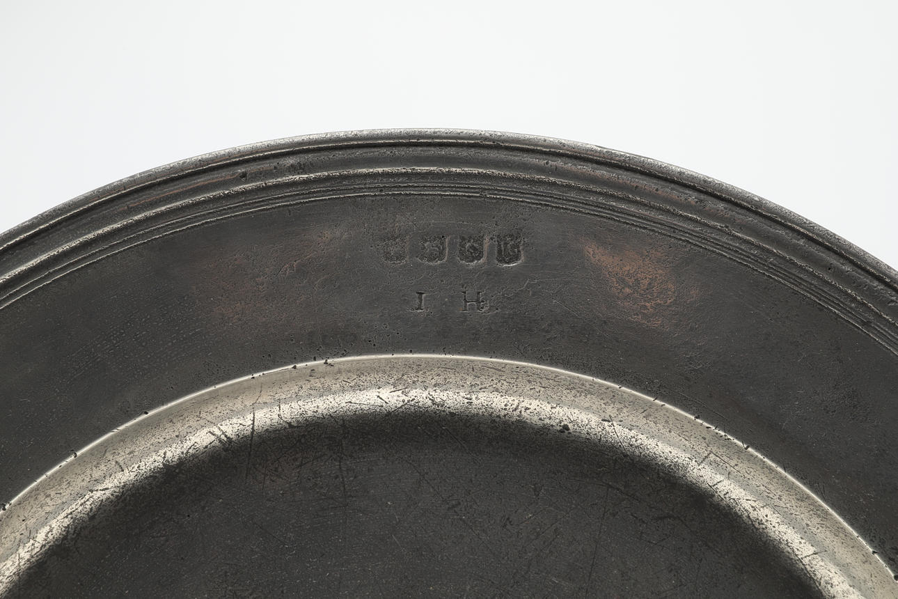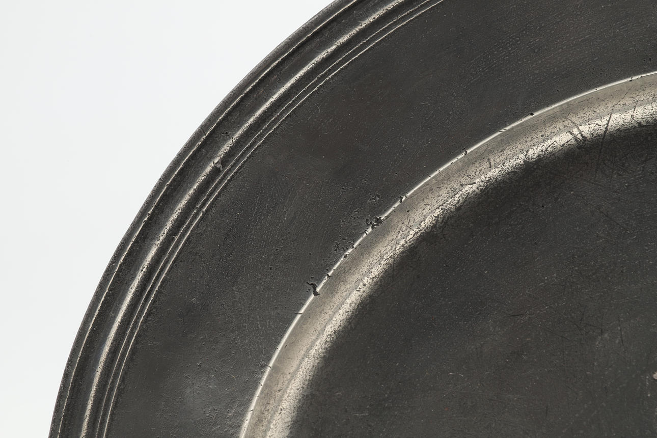 En stor tinlader af lav form med sivkant, med stemplede mærker på fælgen og forskellige initialer til fælgen. 45,5 cm i diameter.