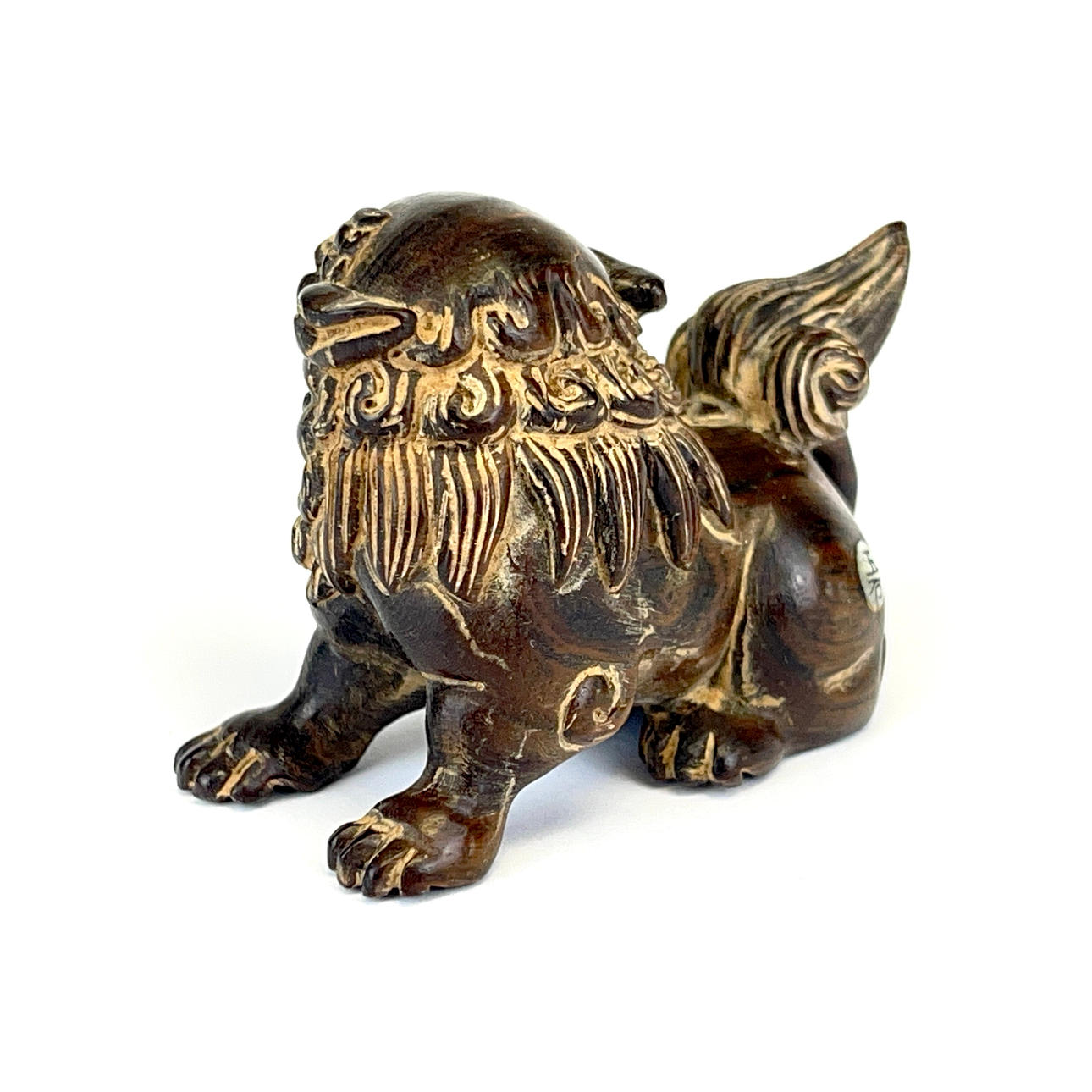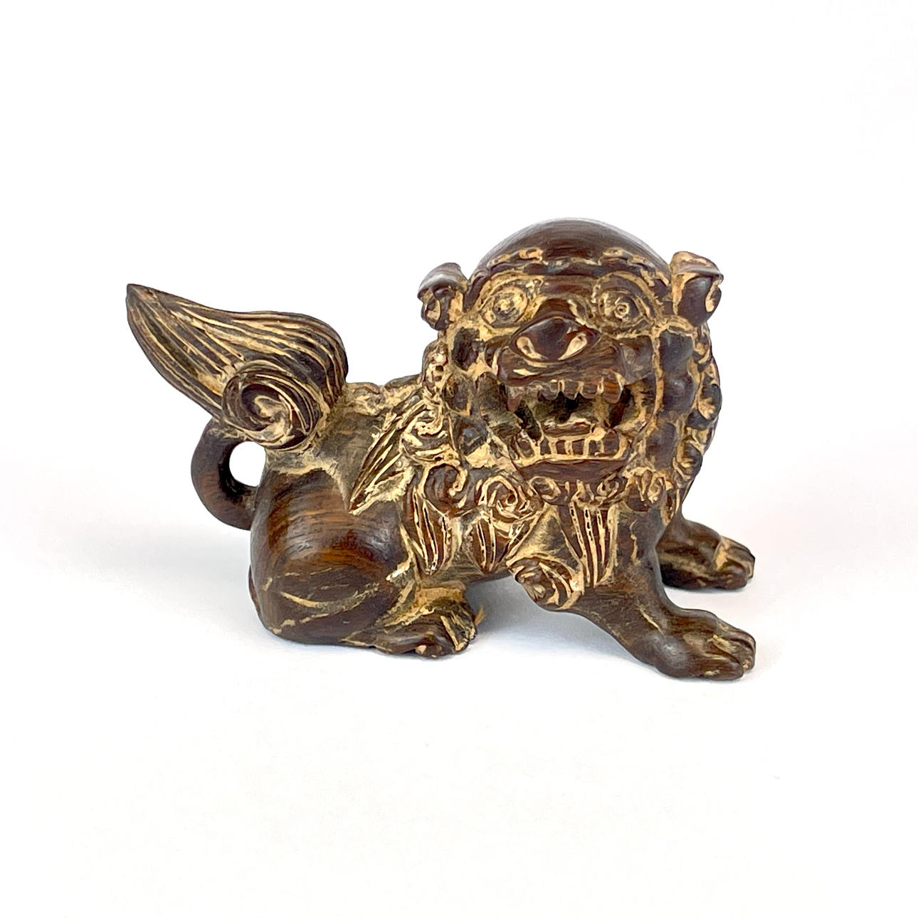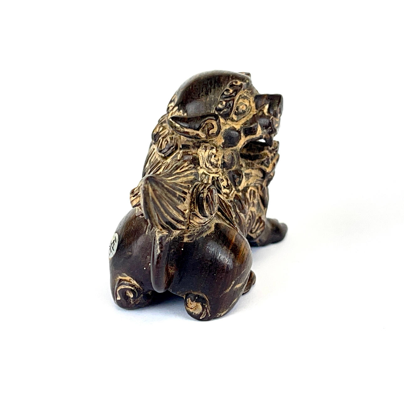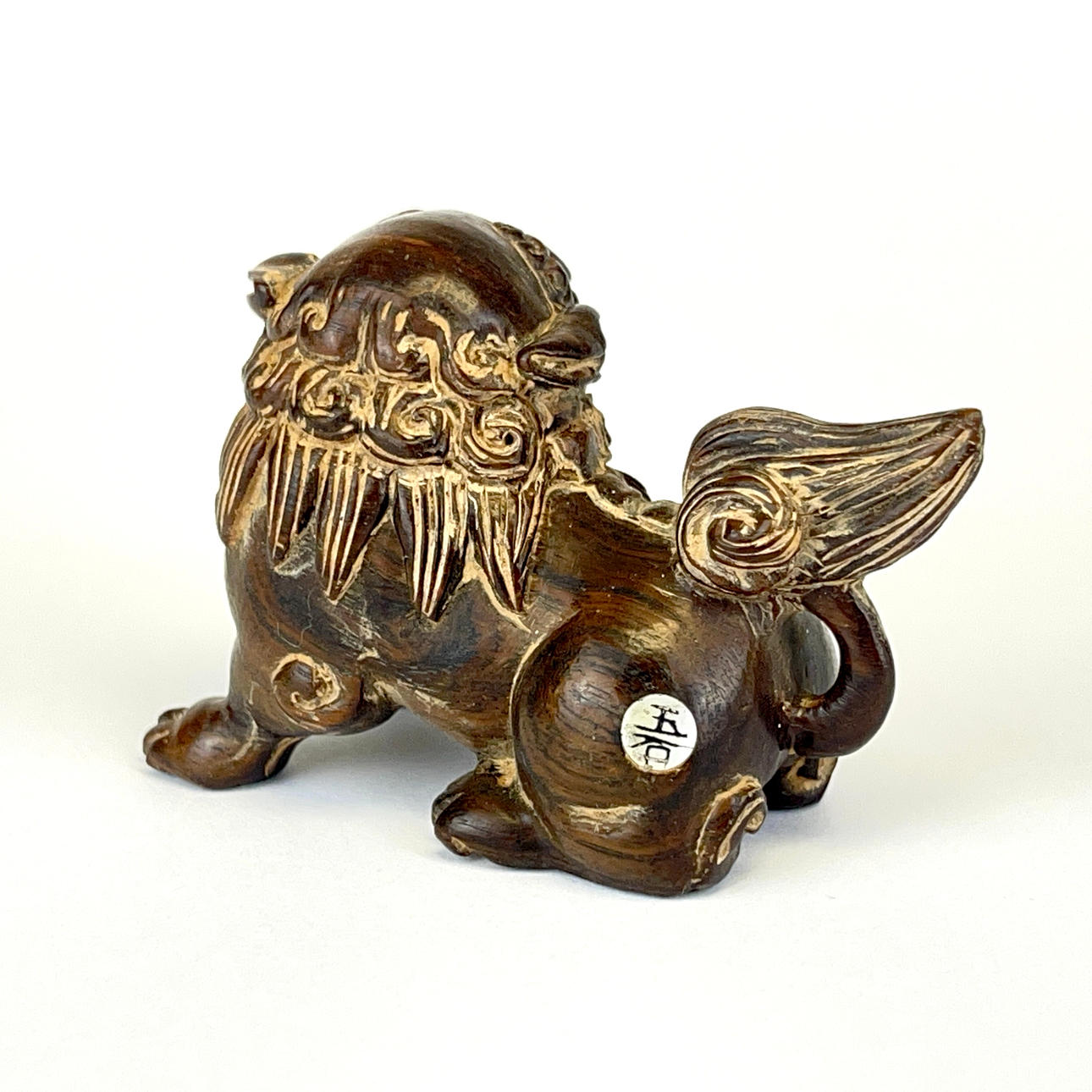 Udskåret løvehundefigur i frugttræ, L. 5,5 cm. H. 4 cm.