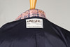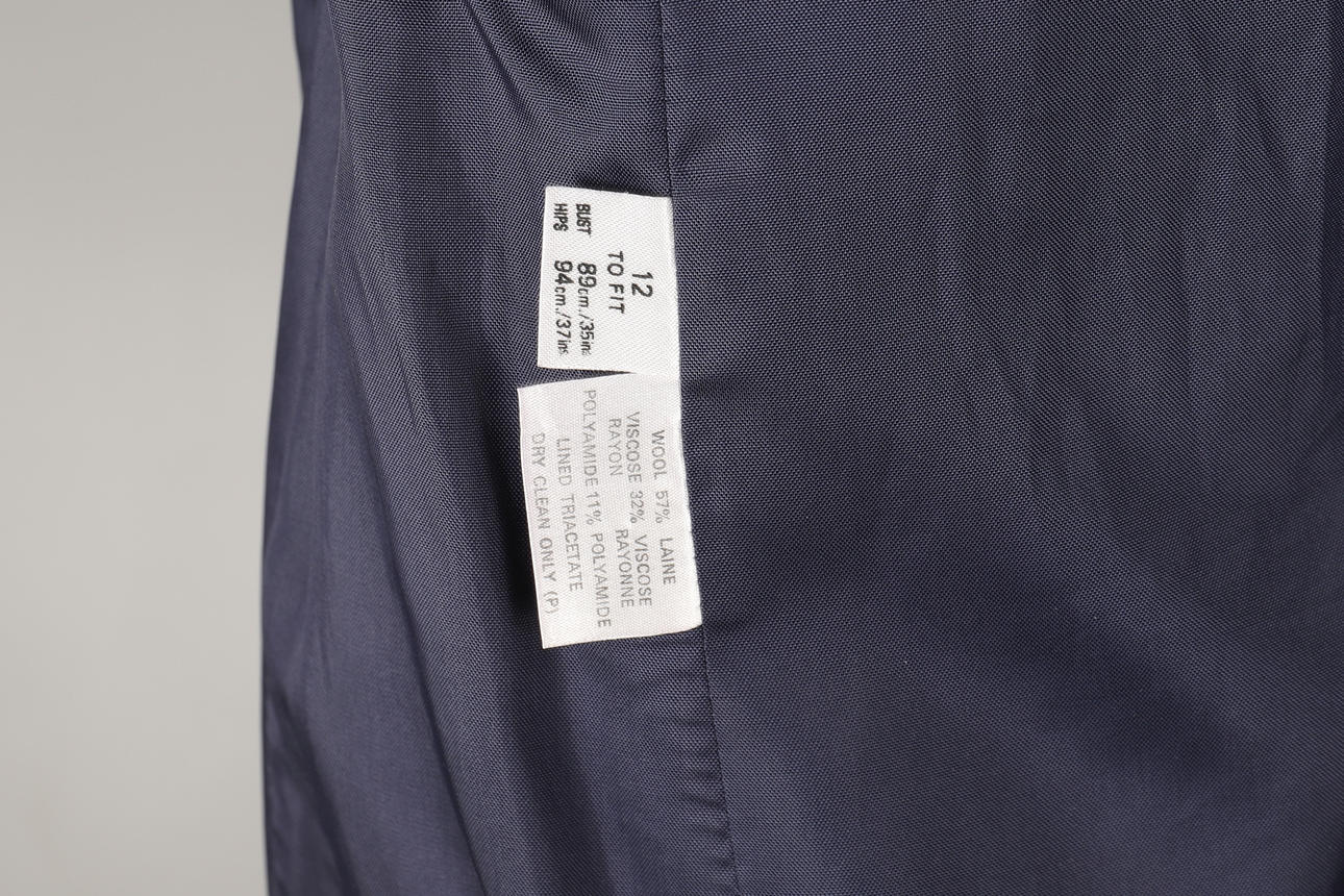 1990'erne, størrelse UK 12, enkeltradet lukning med tre sorte emalje- og guldknapper, to frontlommer, foret i marineblåt triacetat.