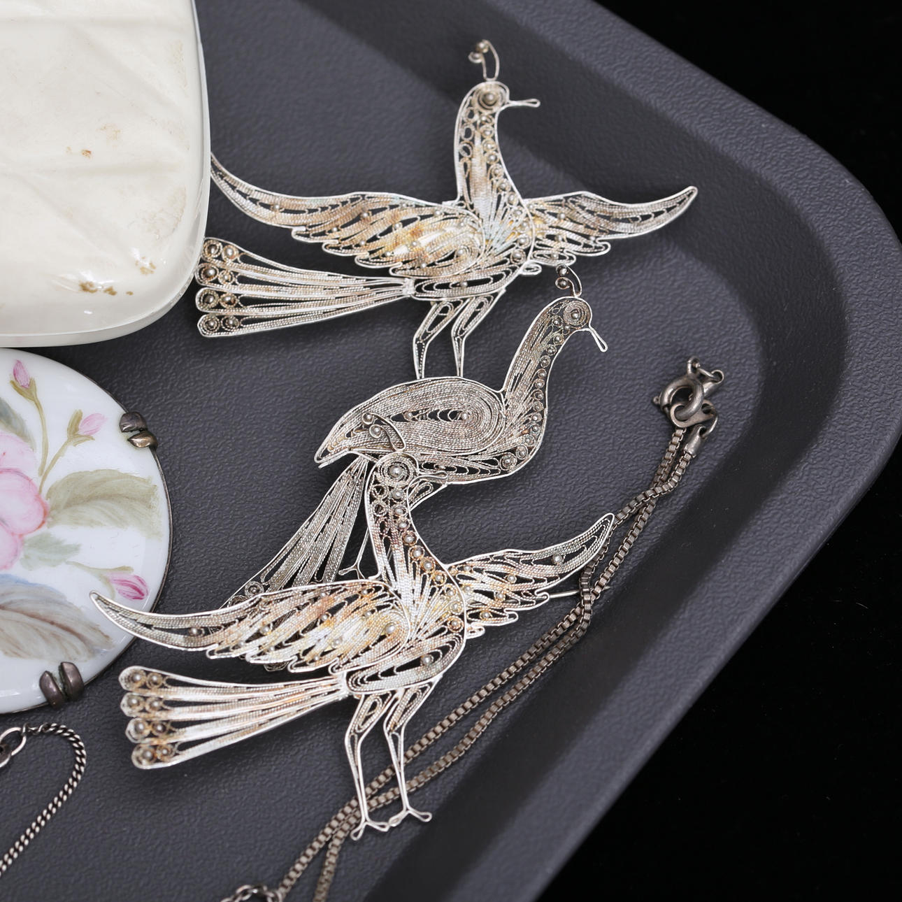 Brocher, 3 stk, filigran, i form af påfugle, største størrelse, højde ca 6,5 cm.