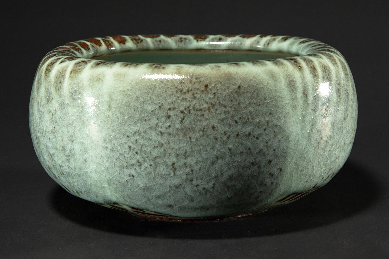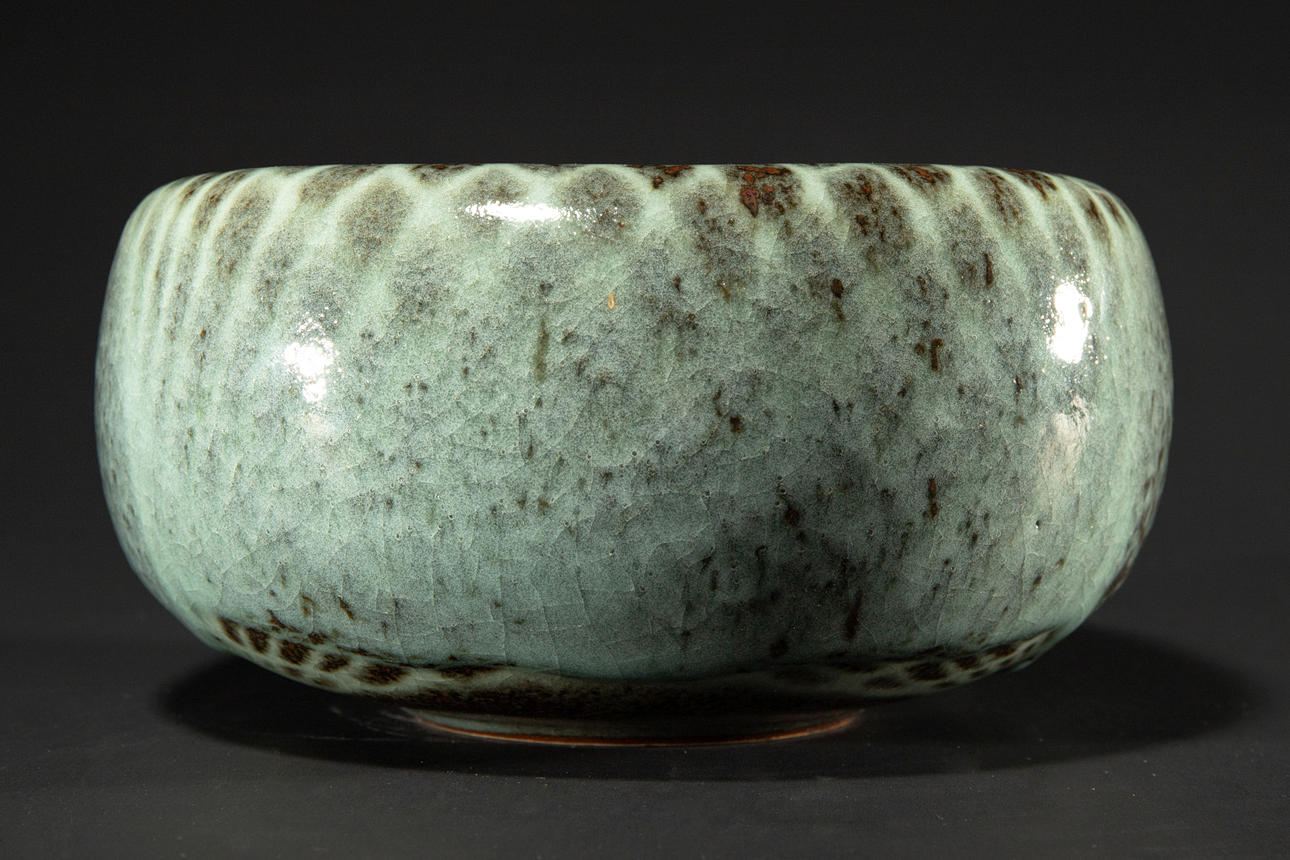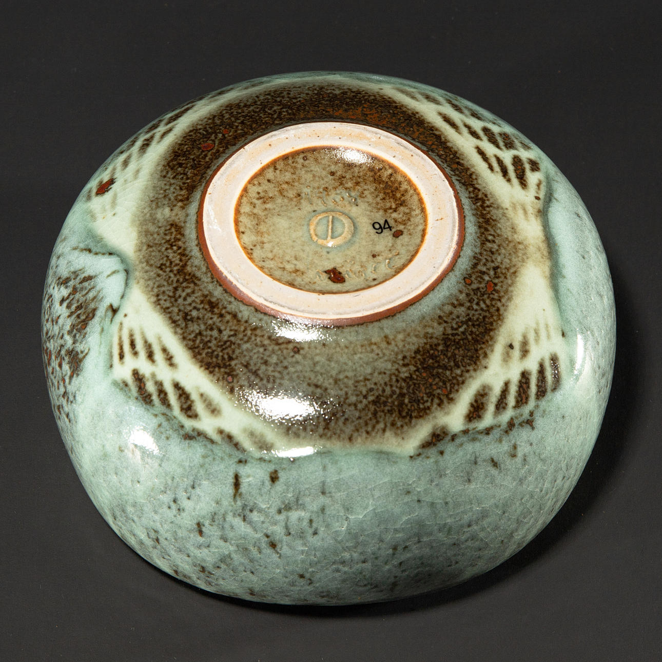 Skræl. Keramik, lertøj med gitterskåret struktur. H. 10 cm/D. 20 cm. Mærket med værkstedsmærke.