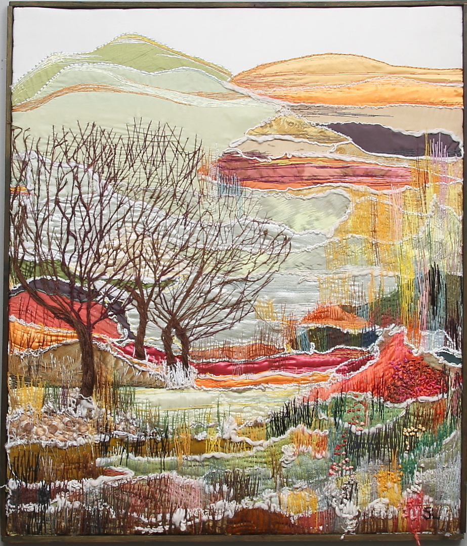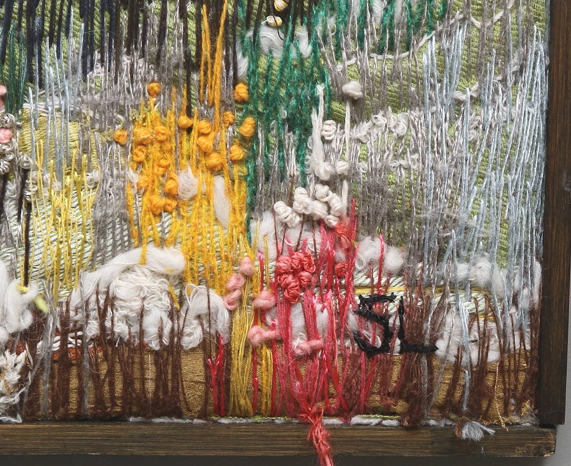 292565. OIDENTIFIERAD KONSTNÄR. Tekstilkunst, landskab, monogrammer signeret SL.