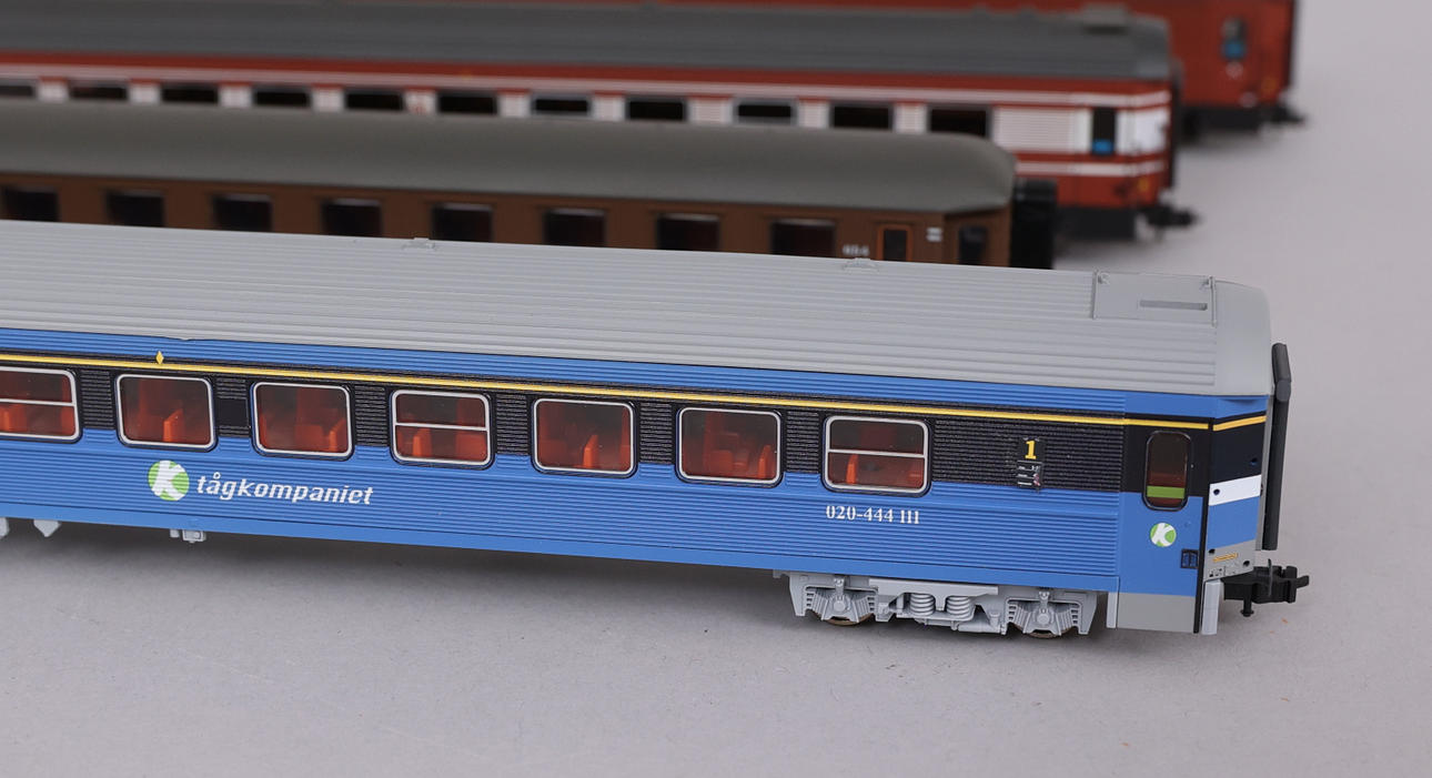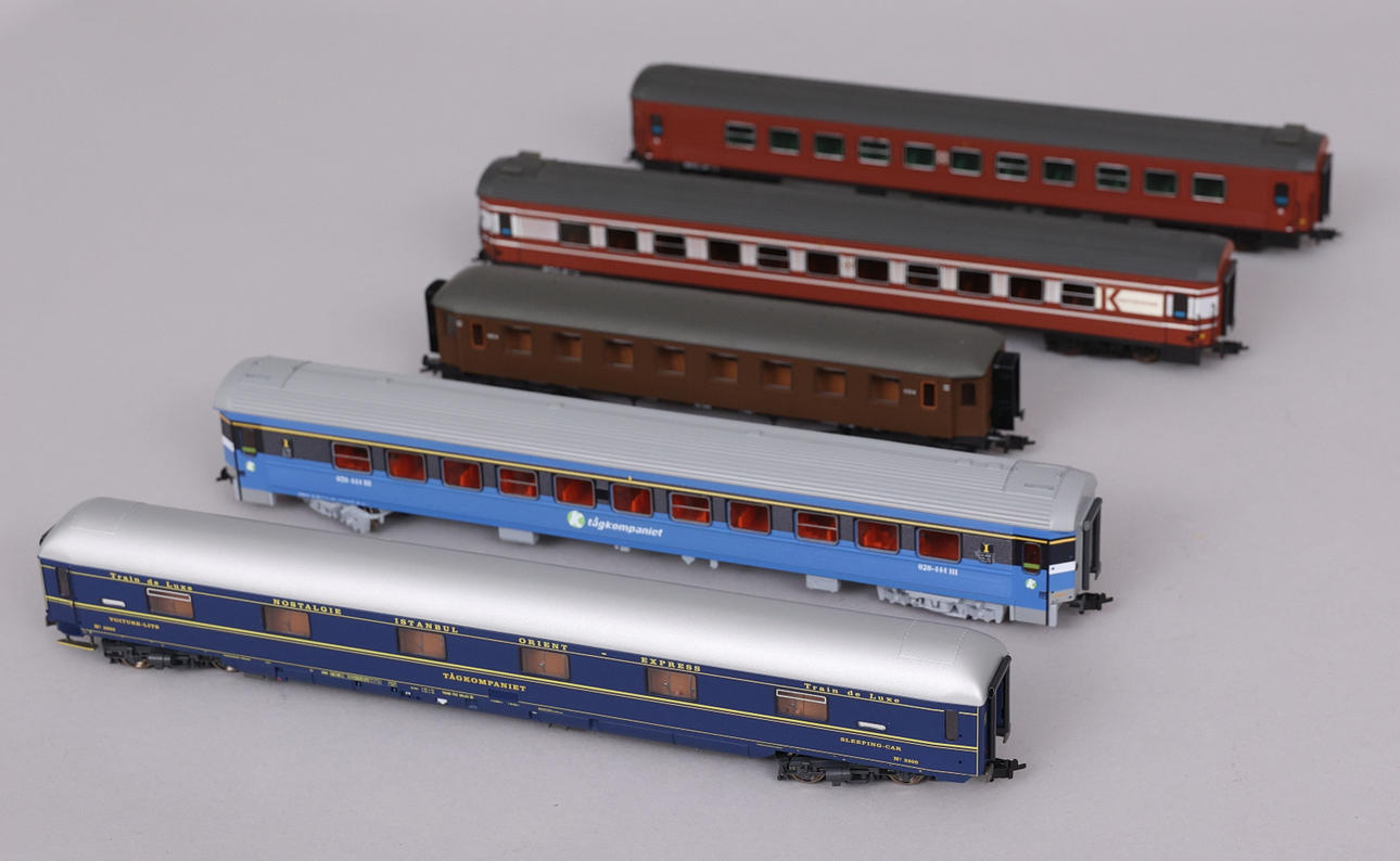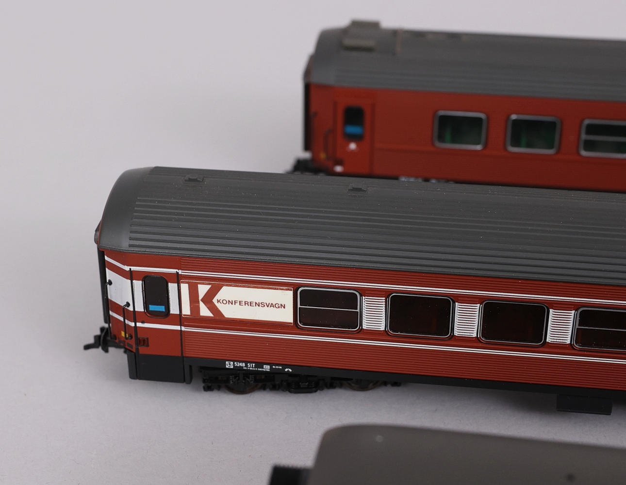 Vognsæt Tågkompaniet Polar Express, i original emballage, Roco 64121 Personbil NSB, i original æske, Roco 44267 Konferencebil SJ S1T, Roco 44722 Vogn SJ B7, Roco 64333.