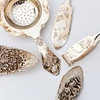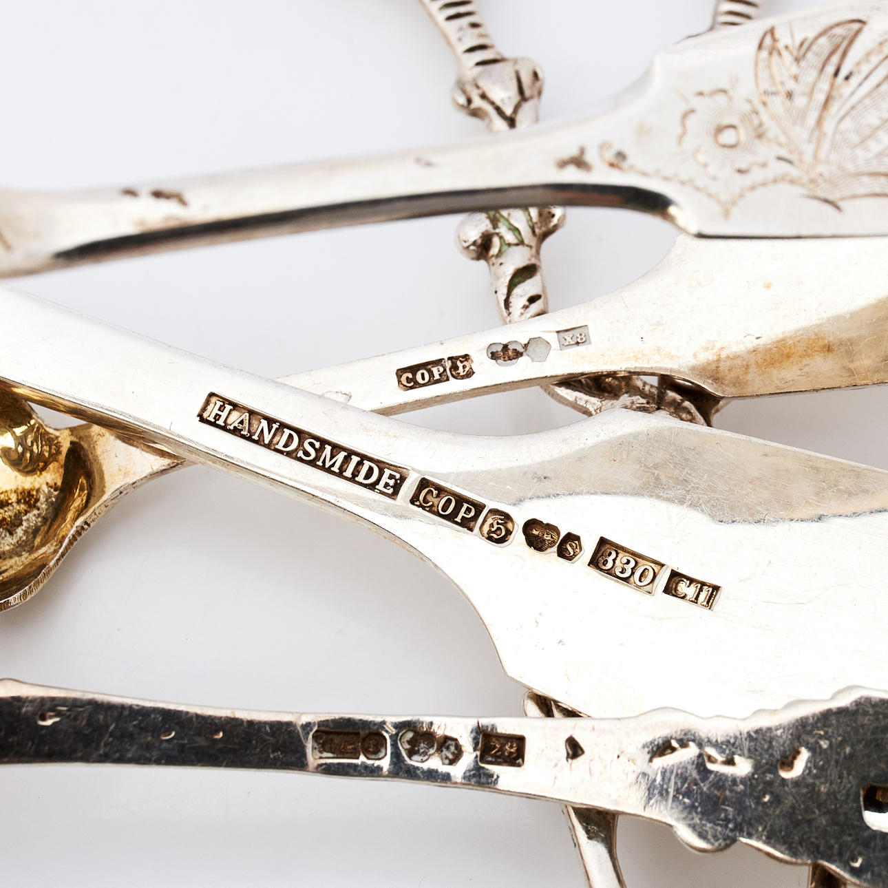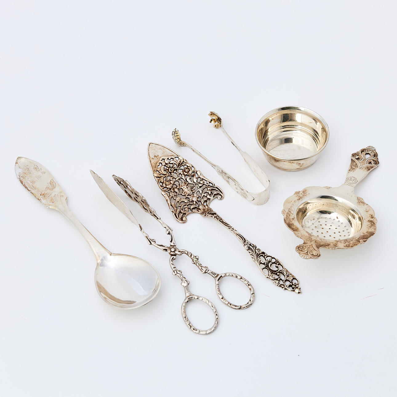 Bestående af: Kagespatel, tang, ske, sukkertang og te-si Totalvægt ca 210 gram.