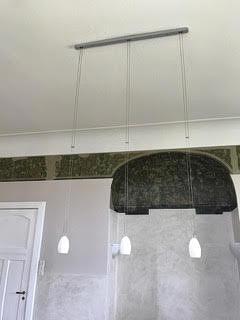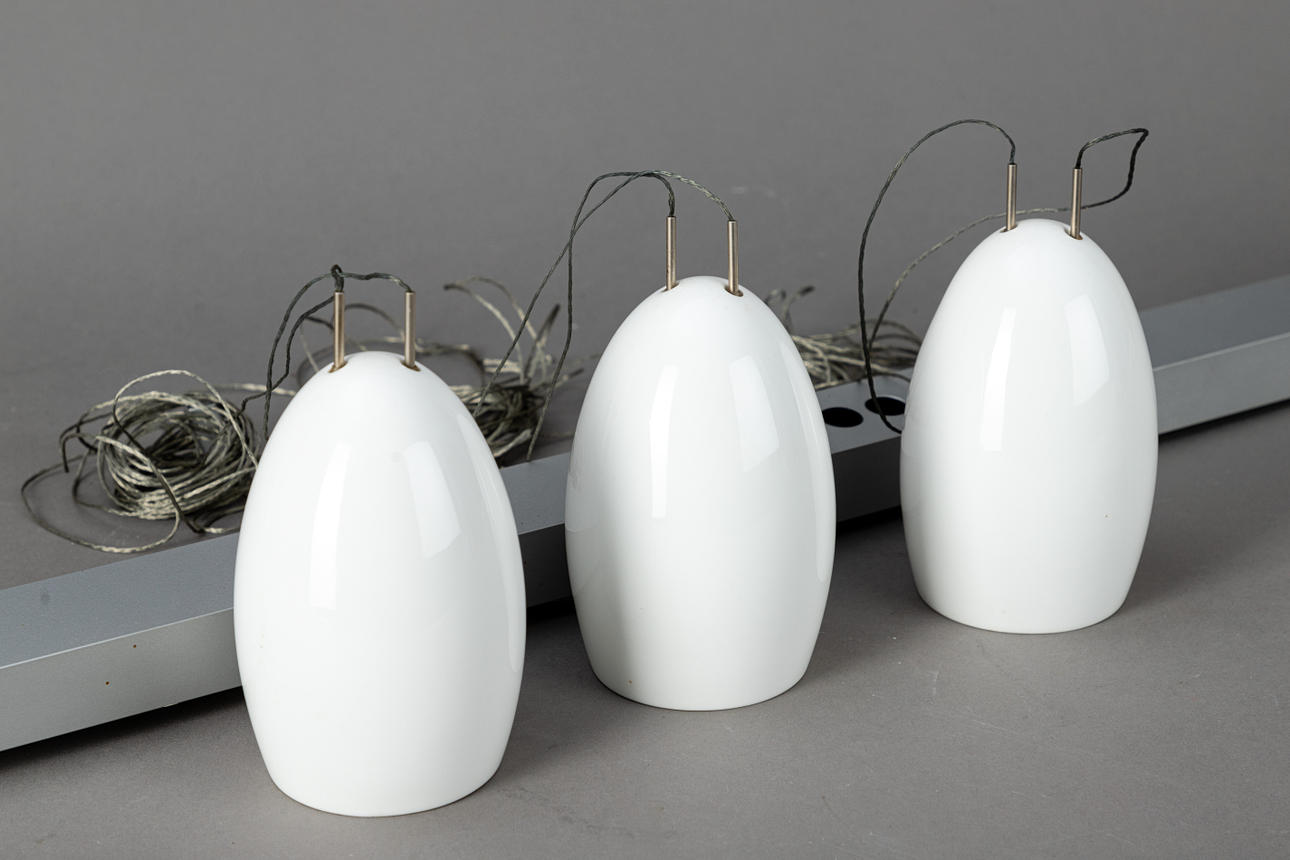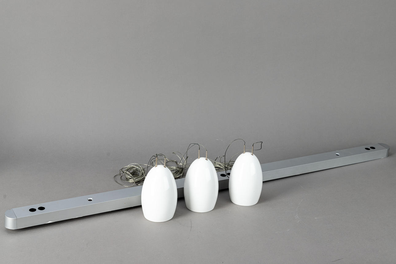 Pendel 'Oh China' af Tobias Grau. 3 pendellamper på en alu loftskinne. Hvide gennemskinnelige 'China Bone' porcelænslampeskærme. Højdejusterbar mellem 30 - 200 cm.