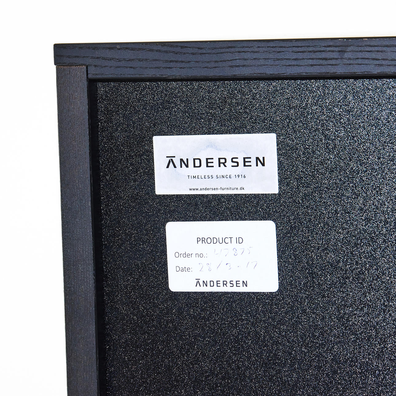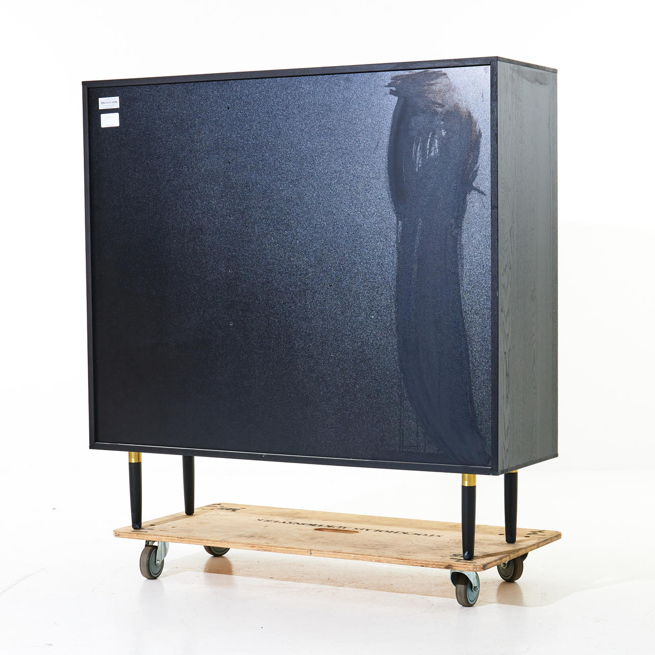 Stel i massiv sortbejdset eg med laminatfronter i hvid. Bredde 130 cm, dybde 43 cm, højde 132 cm.
