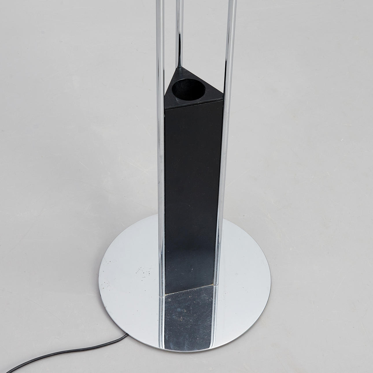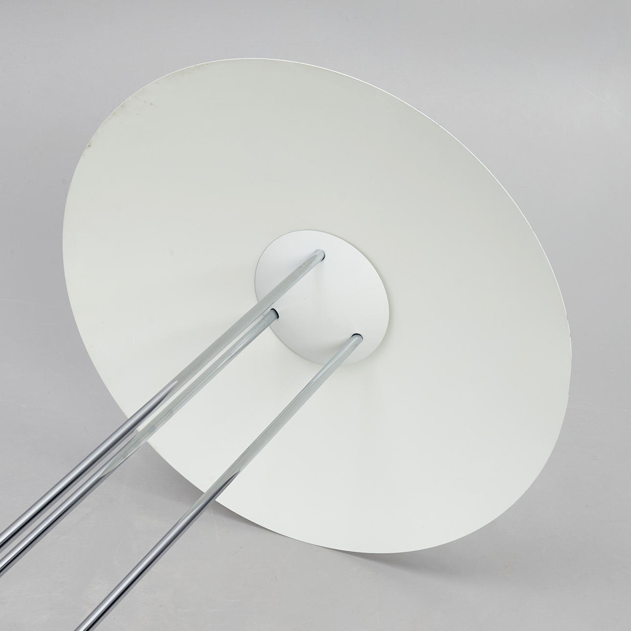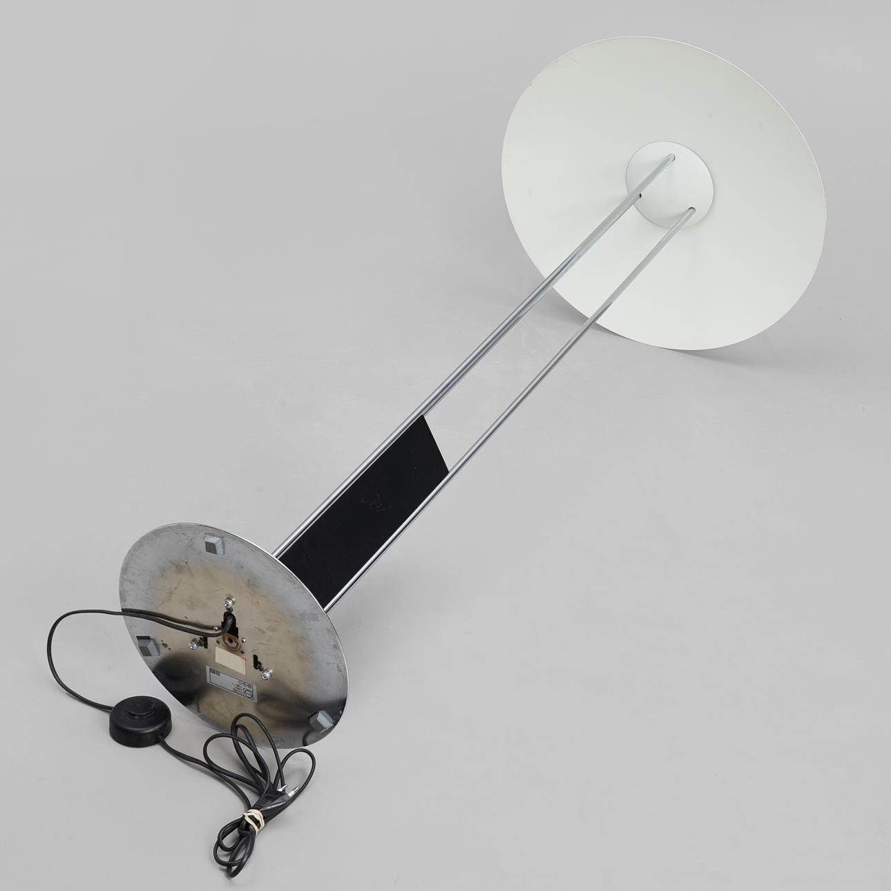 Stel i forkromet metal. Hvidlakeret skærm. Højde ca 122 cm, skærmdiameter 52 cm.