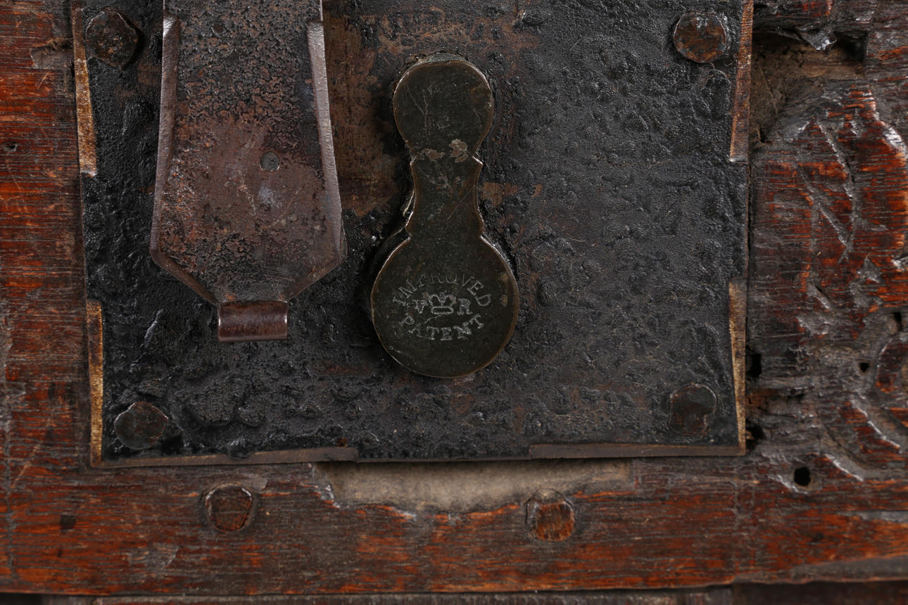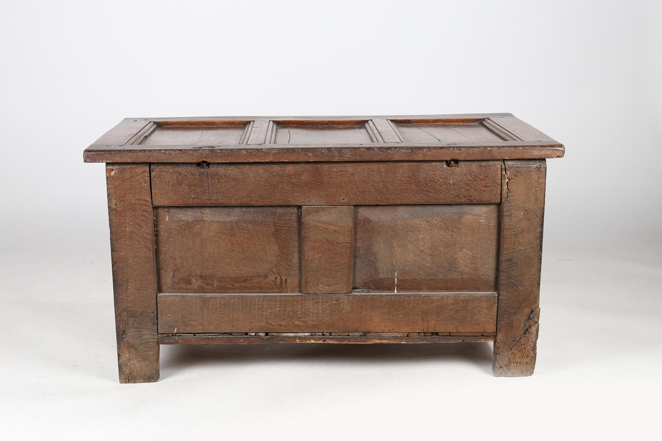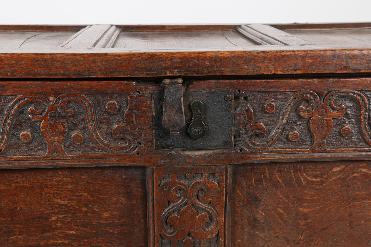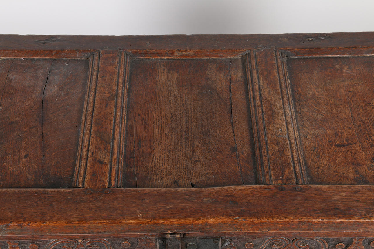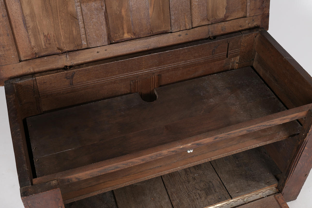 En egetræskasse fra 1600- og 1700-tallet, toppen med tre paneler over en udskåret frise i blade, interiøret sat med en hylde, med en faldfront, 104 cm bred.