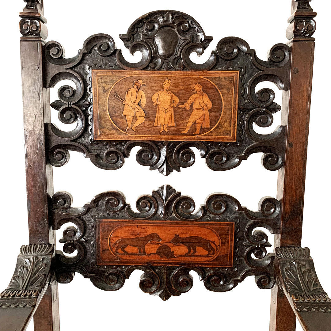 En italiensk udskåret lænestol fra det 18. århundrede med tre indlagte paneler, H. 123 cm.