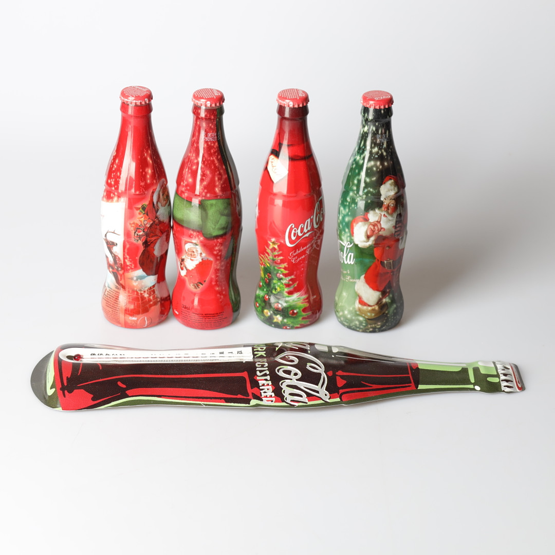 2960917. COCA-COLA, 5 dele, flasker & termometer, 2000'erne.