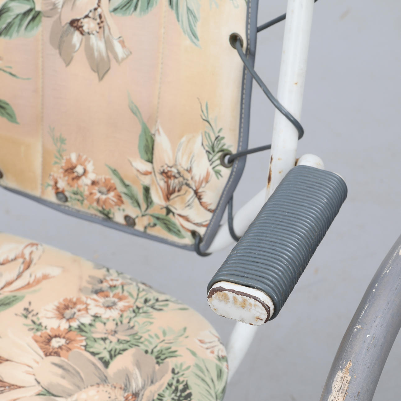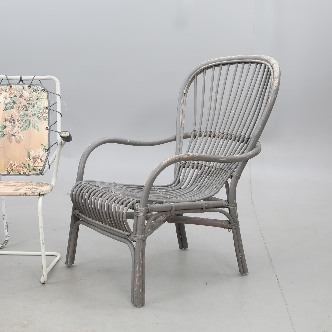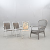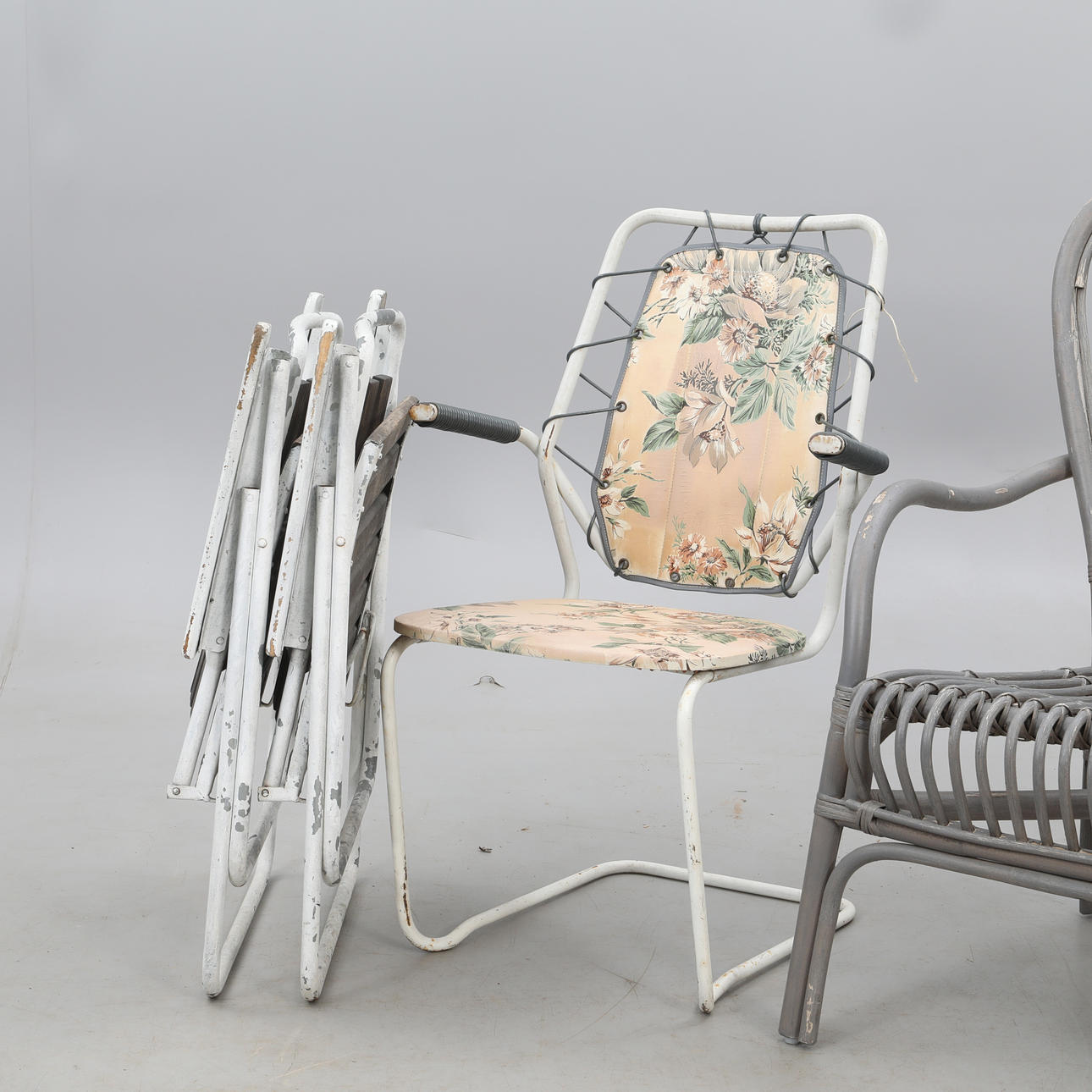 2 træ- og stålrør, foldbar højde ca 64 cm / sædehøjde ca 42 cm / bredde ca 56 cm 1 stol polstret, stålrør, blomstermotiv, højde ca 86 cm / sædebredde ca 43v cm / bredde ca 56 cm Lænestol, bambusrattan, malet. højde ca 96 cm / sædehøjde 40 cm / bredde ca 64 cm.
