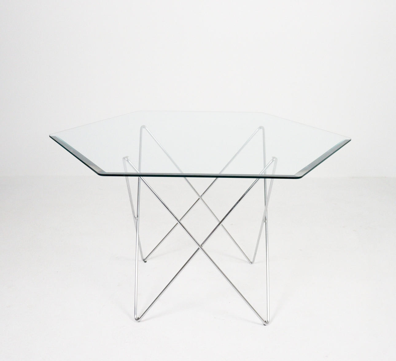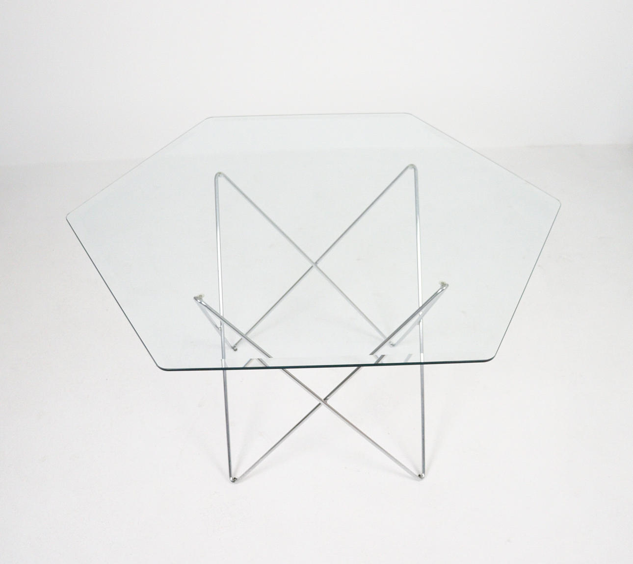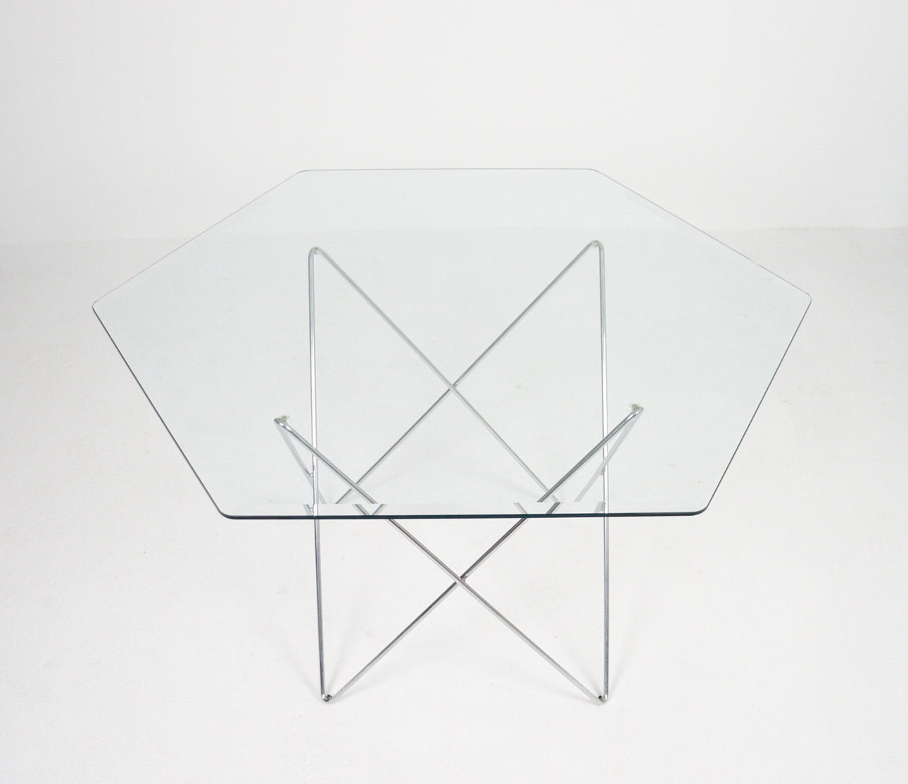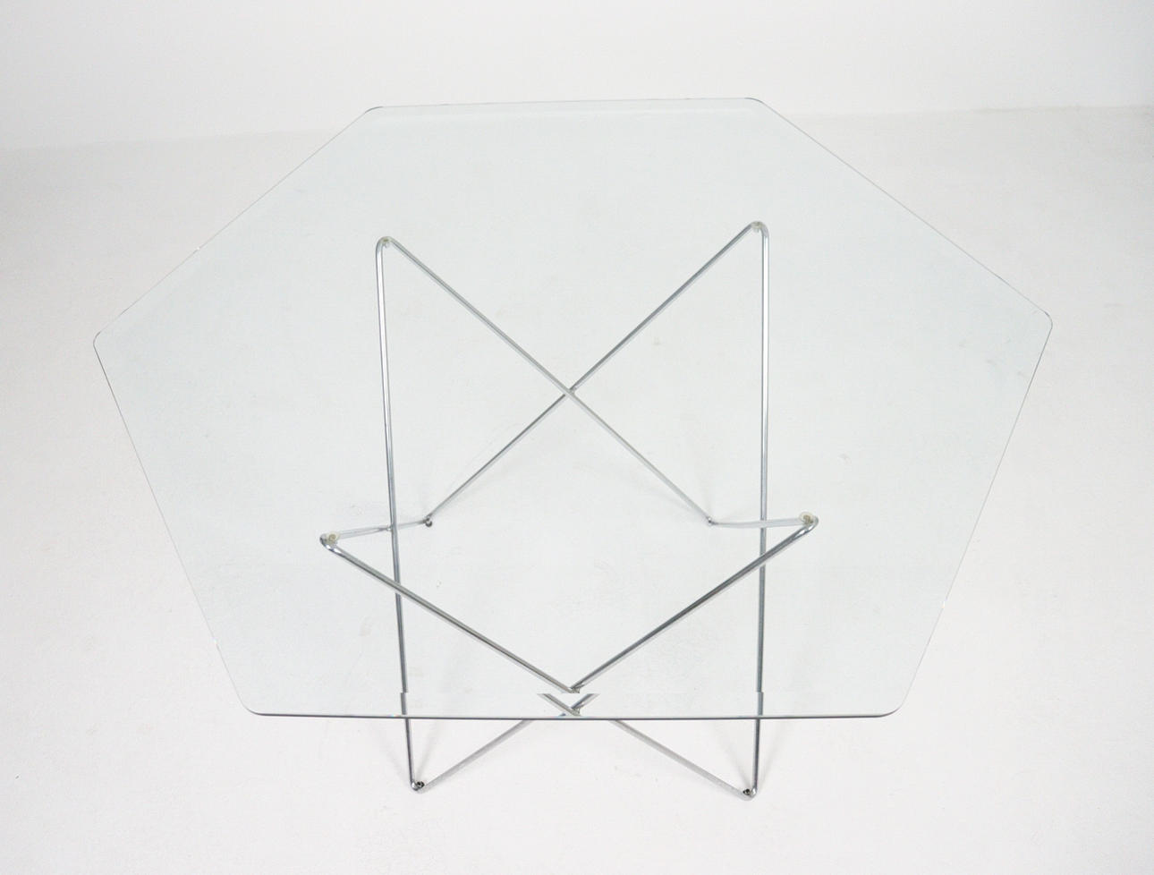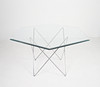 Trådbord fra 1970'erne, metalkonstruktion, løs sekskantet glasplade, mål ca.: H. 74 cm, B. 114 cm, D. 114 cm.