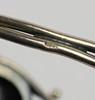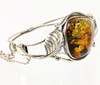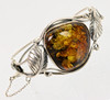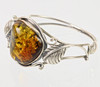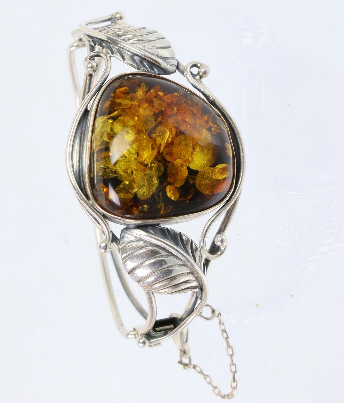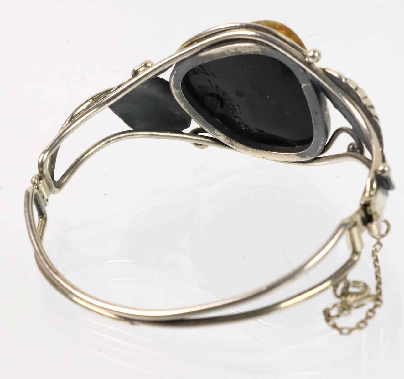 Rav armring er lavet af 925 sølv, fronten er dekoreret med en poleret rav cabochon på ca. 28 x 28 mm, omgivet af blade og ranker på siderne, indvendige mål 6 x 5,3 cm, bredde øverst 3,4 cm, vægt 27,3 gram.