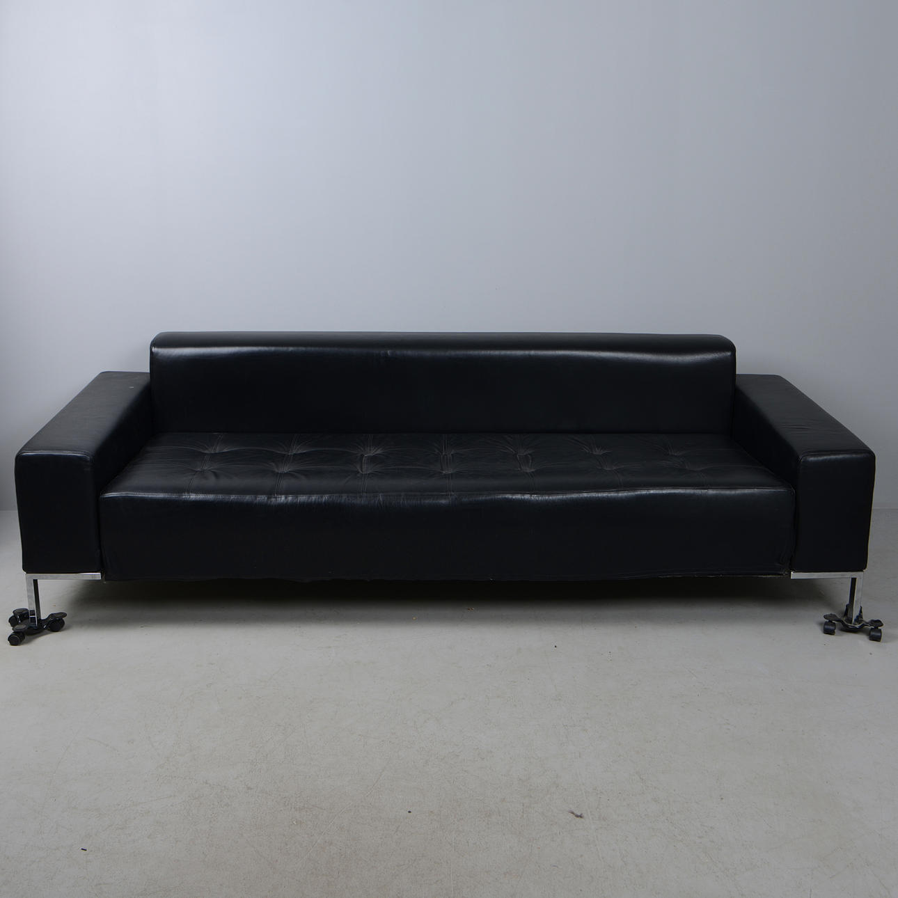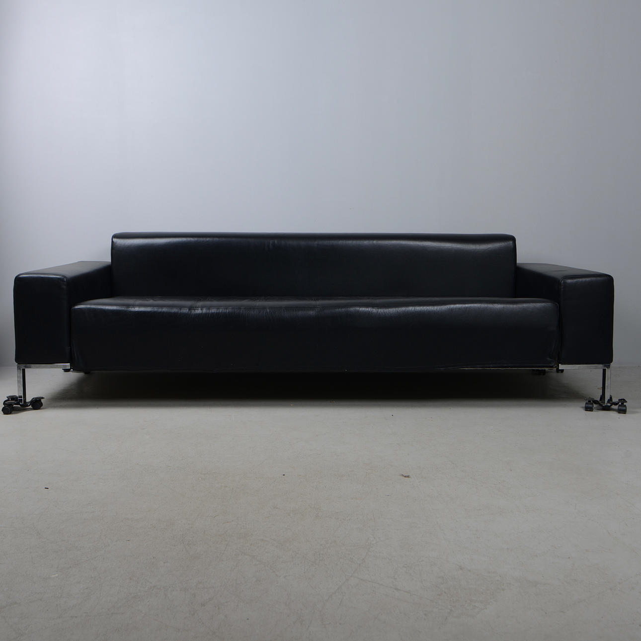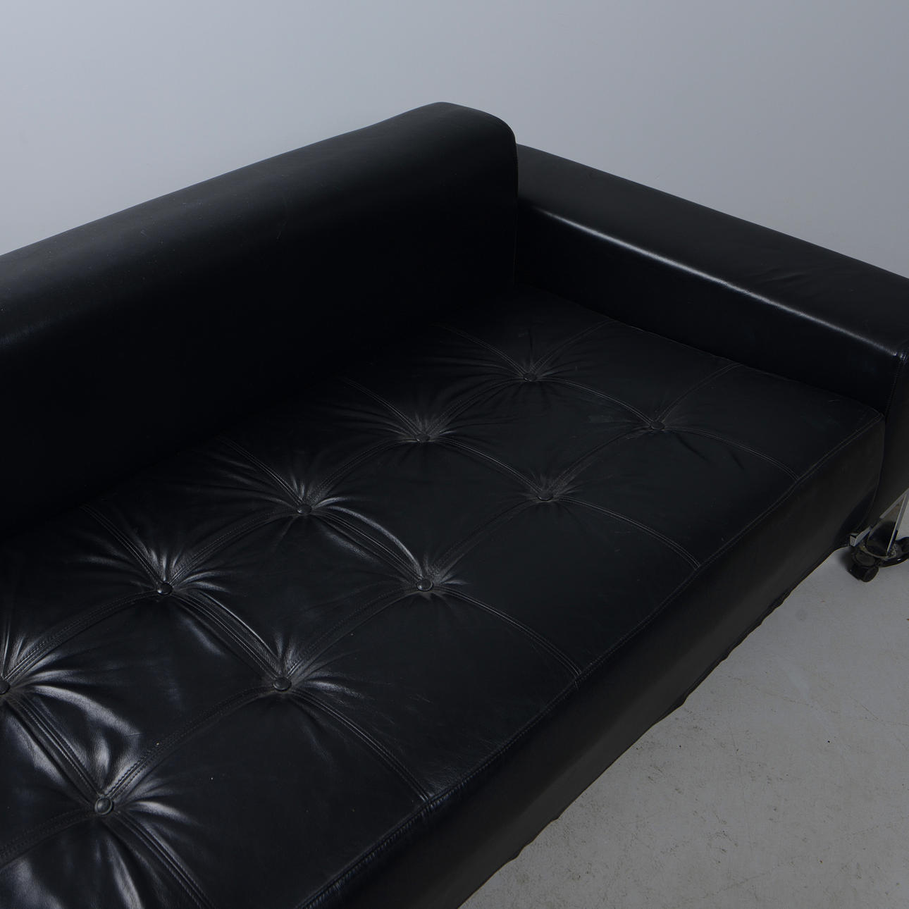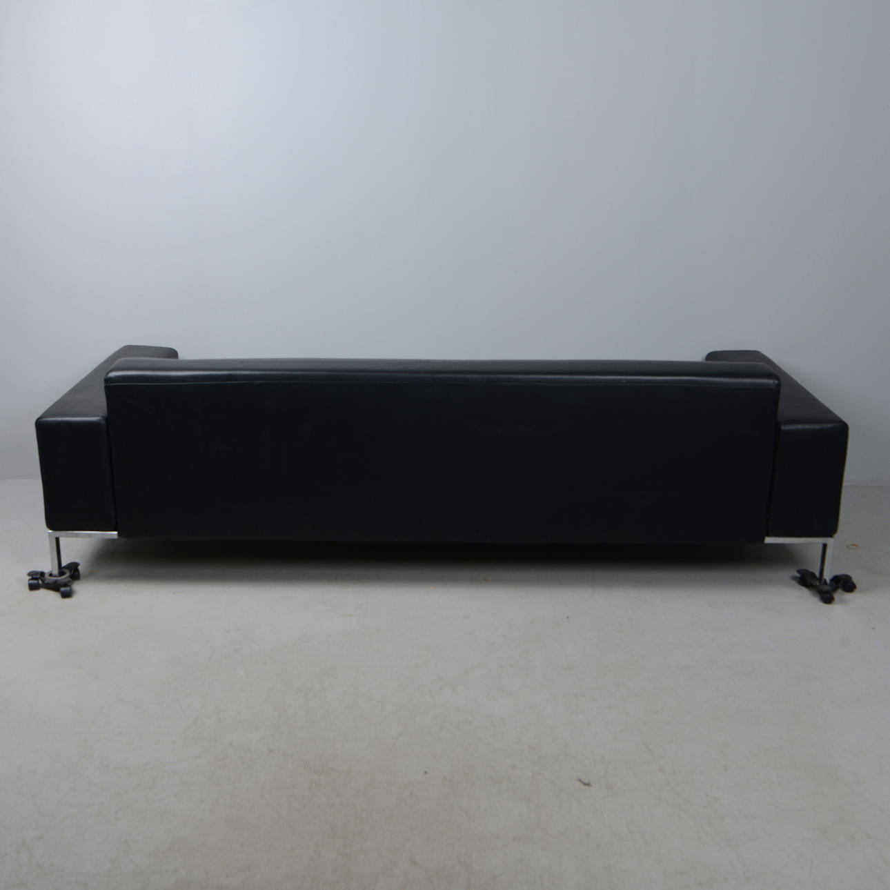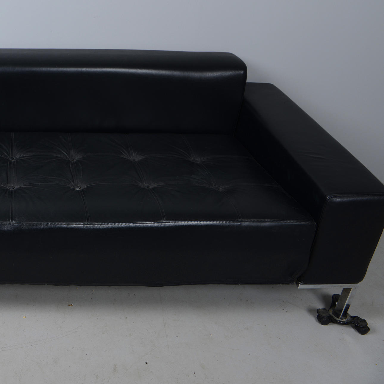 Fuldpolstret sofa med sort læderbetræk. Ben af forkromet stål. Længde 230 cm. Dybde 90 cm. Højde 68 cm. Sædehøjde ca 40 cm.